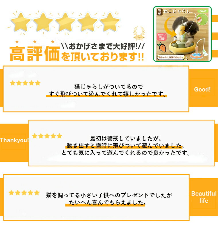 ★商品名 ・猫おもちゃ 電動ねこじゃらし ★材質 ・ABSプラスチック ★重さ ・約475gkg ★電池 ・単4形電池×2本使用(別売) ★パッケージ ・回転盤、鈴、猫じゃらし 、日本語簡易説明書/font> ★生産国 ・中国 ★注意事項★ ※撮影の為、画質等の関係上、色などが実際の商品と若干違ってしまうこともあるかもしれませんがご理解のほどご入札ください。予めご了承ください。 ※製造時期によりデザインや仕様に若干の変更がある場合がございます。予めご了承ください。 ★配送について ※同じ注文で2点以上ご購入頂く場合には、分けて発送可能性がございます。 ※一時欠品の際は、ご注文頂いて7〜14日の入荷となります。 ※万が一ご出荷が遅れる場合はメールでご連絡致します。 ※直接仕入先からの発送する場合があります。 ※パッケージや衣装箱が予告無く変更になる場合がございます。 ※メーカー完売の際はご容赦ください。-商品ポイント- 【飽きずに遊べる猫おもちゃ】 電動猫じゃらしは360°ランダムに回転します、猫ちゃんは捕まえたり、咬みついたり、本物の狩りのように遊べる、猫の狩猟本能を解き放ち、一人ぼっちでも退屈しない。 【狩猟本能満足可能・運動不足対策】 猫じゃらしの動きが不規則で、猫ちゃんも予測できず攻略難関、飽きにくいので長く遊べちゃう。運動不足解消やストレス解消にも効果が期待できる。 【猫おもちゃの興味をひきつける】 ベルボール付き猫ちゃんは猫の好奇心を刺激!猫ちゃんのワクワクが止まらない仕掛けがいっぱい! 【使用簡単・電池給電】 電池給電式で単4アルカリ乾電池2本(別売)を入れ、電池カバーを取り付け、本体の電源ボタンを押すにすれば、電動猫じゃらしオンにします。 【安全・安心な構造】 電動猫じゃらしの全体の縁は滑らかに加工されている上、裏には滑り止めパッドが付いていることにより、床に優しく、優れた安定性も持っていて、安全性が高くなり、猫ちゃんは思い切り遊べる。