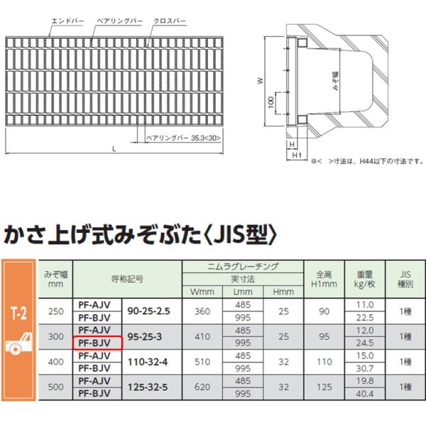 ●特徴 高品質な公共建築協会評価対象製品です。 安心の国内メーカー、国内製造品です。 主部材と補助部材が接合された圧接型のグレーチングです。 JIS種別:1種 ●仕様 メーカー:株式会社ニムラ 品名:かさ上げ式みぞぶた タイプ:ノンスリップ(スベリ止め) 材質:鋼板製(SS400) 表面処理:溶融亜鉛メッキ 耐荷重:T-2 みぞ幅:300mm グレーチング寸法:410mm×995mm×95mm(25+70) グレーチング重量:約24.5kg 呼称記号:PF-BJV 95-25-3 ノンスリップ各サイズ↓耐荷重ごとに若干寸法が異なります。詳細は商品画像でご確認ください。 みぞ幅(mm)グレーチング寸法(mm)耐荷重 幅長さ全高 250 360 485 90 T-25 - T-14 T-2 995 T-25 - T-14 T-2 300 410 501 95 T-25 - T-14 T-2 995 T-25 - T-14 T-2 400 510 501 110 T-25 T-20 T-14 T-2 995 T-25 T-20 T-14 T-2 500 620 501 125 T-25 T-20 T-14 T-2 995 - T-20 T-14 T-2 プレーン各サイズ↓耐荷重ごとに若干寸法が異なります。詳細は商品画像でご確認ください。 みぞ幅(mm)グレーチング寸法(mm)耐荷重 幅長さ全高 250 360 485 90 T-25 - T-14 T-2 995 T-25 - T-14 T-2 300 410 501 95 T-25 - T-14 T-2 995 T-25 - T-14 T-2 400 510 501 110 T-25 T-20 T-14 T-2 995 T-25 T-20 T-14 T-2 500 620 501 125 T-25 T-20 T-14 T-2 995 - T-20 T-14 T-2 細目はこちら