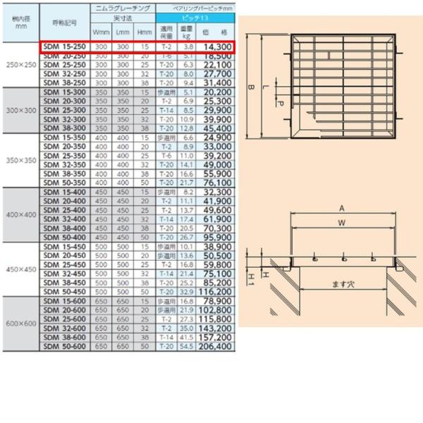 ●特徴 ニムラ製集水桝用ステンレスグレーチング。 安心の国内メーカー国内製造で、高品質な公共建築協会評価対象製品です。 ステンレスグレーチングは、材質がSUS304を使用し、サビに強く高級感を保ち、美観に優れた商品です。 ●仕様 メーカー:株式会社ニムラ 品名:集水桝用 ステンレス製 グレーチング プレーンタイプ(一般型) 材質:ステンレス(SUS 304) 耐荷重:T-2 マス内径:250mm ベアリングバーピッチ:13mm グレーチング寸法:300mm×300mm×15mm 重量:約3.8kg 呼称記号:SDM 15-250 ※受枠は付属しません。 各サイズ 耐荷重クリックで商品ページへ↓ 桝内径(mm) 実寸法(mm) ベアリングバーピッチ 縦 横 高さ 30 22 15 13 10 250×250 300 300 15 歩道 歩道 歩道 T2 T2 300 300 20 歩道 T2 T2 T6 T14 300 300 25 T2 T6 T14 T20 T20 300 300 32 T14 T20 T20 T20 T20 300 300 38 T20 T20 T20 T20 T20 300×300 350 350 15 歩道 歩道 歩道 歩道 T2 350 350 20 歩道 歩道 T2 T2 T6 350 350 25 T2 T2 T6 T14 T20 350 350 32 T2 T14 T14 T20 T20 350 350 38 T14 T20 T20 T20 T20 350×350 400 400 15 歩道 歩道 歩道 歩道 歩道 400 400 20 歩道 歩道 T2 T2 T2 400 400 25 歩道 T2 T2 T6 T14 400 400 32 T2 T2 T14 T20 T20 400 400 38 T6 T14 T20 T20 T20 400 400 50 T20 T20 T20 T20 T20 ノンスリップタイプはこちら