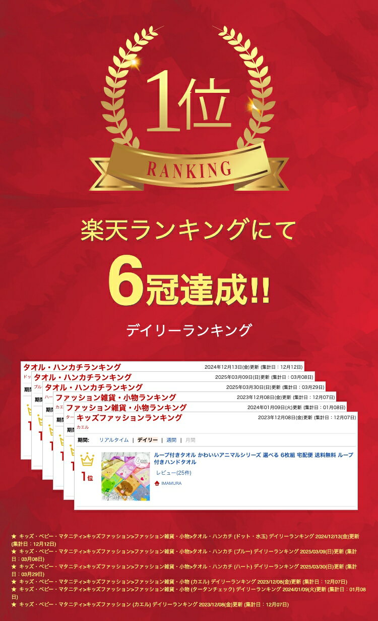 商品情報原産国中国製素 材綿100%サイズ約34×34cmご使用にあたってのご注意・濡れたまま長時間放置しないでください。・塩素系漂白剤は使用しないでください。・乾燥機は使用しないでください。ループ付きタオル 選べる 6枚組 かわいいアニマルシリーズ 宅配便 送料無料 ループ付きハンドタオル お名前が書けます♪保育園、幼稚園の入園準備に♪ふわふわ可愛い♪ かわいいアニマル柄のループ(ひも)付きハンドタオルです。お名前を書くスペースがありますので、保育園や幼稚園用のタオルに最適です。ループが付いていますので、キッチンや洗面所でお使いいただくことも出来ます。お子さん専用のタオルとして、洗面所に掛けておくのも良いですね♪ 2