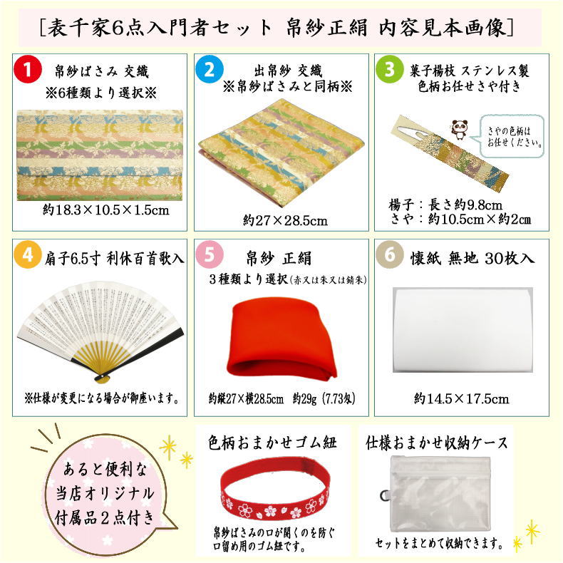 ≪セット内容≫ 1.帛紗ばさみ 交織 6種類より選択 約18.3×10.5×1.5cm 2.出帛紗 交織※帛紗ばさみと同柄※ 約27×28.5cm 3.菓子楊枝 ステンレス製 色柄お任せさや付き 楊子:長さ約9.8cm さや:約10.5cm×約2cm 4.扇子6.5寸 利休百首歌入 ※仕様が変更になる場合が御座います。 5.帛紗 正絹(赤又は朱又は錆朱) 約縦27×横28.5cm 約29g(7.73匁) 6.懐紙 無地 30枚入 約14.5×17.5cm 当店オリジナル付属品 ・色柄おまかせゴム紐 ・収納ケース 別売りで名札があります。(お友達との区別に便利です) 表千家用(同柄セット・正絹帛紗・黄骨扇子・他は交織)6点セット (正絹帛紗 ・出桐り・11340) 【コンビニ受取対応商品】 その他の入門者・お稽古セットはこちら→一緒に購入すると便利です。帛紗ばさみ用名札お友達との区別に便利です。