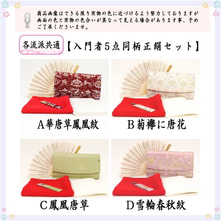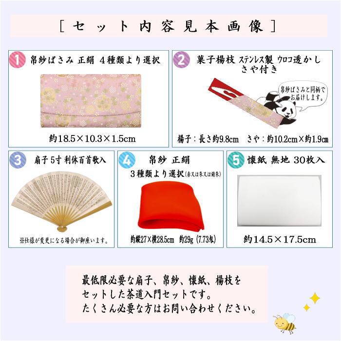 5点正絹入門者セット 全正絹 各流派 ≪セット内容≫ 1.帛紗ばさみ 正絹 4種類より選択 約18.5×10.3×1.5cm 華唐草鳳凰紋 菊襷に唐花 鳳凰唐草 雪輪春秋紋 2.菓子楊枝 ステンレス製 ウロコ透かし さや付き 楊子:長さ約9.8cm さや:約10.2cm×約1.9cm 3.扇子 5寸 利休百首歌入 ※地模様は変更になる場合が御座います。 4.帛紗 正絹 3種類より選択(赤又は朱又は錆朱) 約縦27×横28.5cm 約29g(7.73匁) 5.懐紙 無地 30枚入 約14.5×17.5cm (の礼丸中・11320) 【コンビニ受取対応商品】 その他の入門者・お稽古セットはこちら→