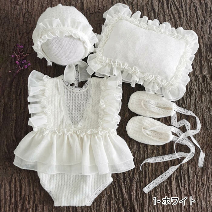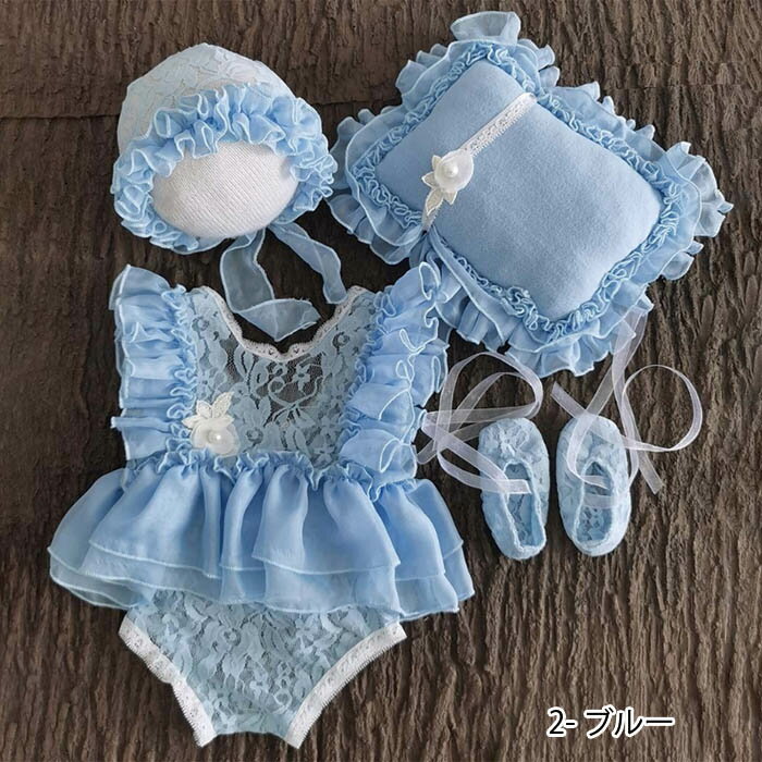 ニューボーンフォト ベビー レース フリル コスチューム セット 女の子 枕 帽子 ジャンプスーツ シューズ 5カラー 新生児 月齢 アート 寝相アート バースデーフォト おひるねアート インスタ映え 写真撮影 撮影小物