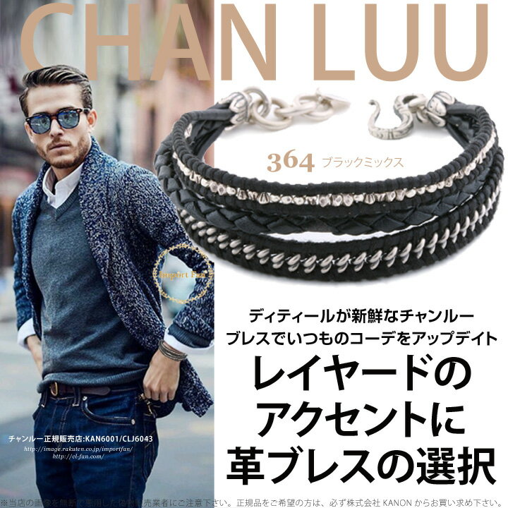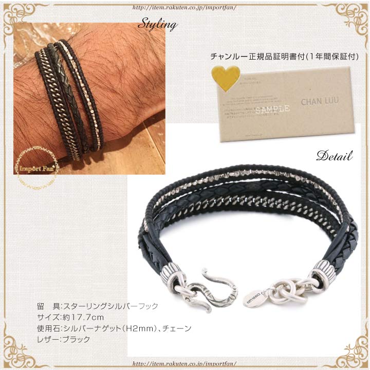 チャンルー メンズ ナゲット レザー チェーン ミックス 3連 ブレスレットは、 シルバーナゲットとチェーンをレザーにあしらい、編みレザーとともに3連に仕立てたブレスレットです。 3連ですが、ラップタイプではなくスターリングシルバーのフックにかけるだけなので、簡単に腕もとをアップデートできます。 細めの3連なので子供っぽくならず、留め具のスターリンシルバーにも細工が施され、おしゃれのポイントになってくれます。抑えた色味なので時計や他のブレスレットと重ねづけしても品よくカジュアルに決まります。 サイズ:15.5cm(スターリングシルバーのフック式の留め具にはCHAN LUUのロゴプレートと2cmのアジャスターがついており、アジャスターの範囲でサイズ調節が可能です。) ※付属のアジャスターの調整範囲で着用が難しい場合は、調整用の丸カンをパーツ屋さん等でご自身で調達しご対応ください。 男性細身サイズの方は3連のブレスレットとしてお楽しみいただけます。フックの位置により、女性標準サイズの方でも抜け落ちることなく着用可能です。 風合いを生かす為、必要以上の染色や完全な色止め加工は行っておりません。雨や水にぬれた場合や摩擦により、シミ・水ぶくれ・色落ち・退色の可能性がありますので十分にご注意下さい。 この商品はベトナムで一つ一つ職人の手によって手作業で作られてるため、製品化する段階でシミ・キズ・色ムラが付く事があります。天然素材を使用しているため、同じ商品でも形や色、模様などに若干の個体差がございます。 他店舗でも販売しておりますため、在庫の個数がございましても、完売もしくはおとりよせとなる場合がございます。予めご了承くださいませ。 付属:チャンルー純正ポーチ(カラーやプリントはおまかせ)、ブランド紙タグ、紙タグ、正規品証明書 こちらの商品には、チャンルーの正規品証明書(購入日より1年間有効の補償付)がついています。 こちらは当店のギフトボックスに入れて大切にお届けさせていただきます。