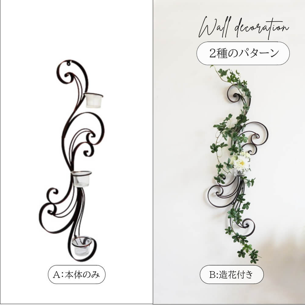 玄関やリビングの壁を華やかに彩る壁掛け花瓶。シンプルながらもクラシカルな雰囲気のあるアイアン製のフレームデザインが魅力です。アンティーク調のかすれた塗装仕上げが、どんな空間にも上品なアクセントを加えます。取り外し可能なガラスカップつ付き。ビス一本で飾ることができ、手軽にフラワーアレンジメントを楽しむことができます。新築祝いや引っ越しのお祝い、リノベーションの際のインテリアとしても最適です。また、個性的なインテリアを求める方にもぴったりのアイテム。壁面を活用して、おしゃれで心地よい空間作りをお楽しみください。 ※カラーはアンティーク感のあるダークブラウンカラーで少しかすれのある塗装です。 ※ガラスカップは取り外し可能です。 【A:本体のみ 商品仕様】 本体サイズ幅22cm×高さ66cm×奥行10cm ガラスカップサイズ幅6cm×高さ4.5cm ガラスカップ数3個 重さ1.2kg 素材アイアン、ガラス 品番1503 IFH 005 【B:造花付き 商品仕様】 本体サイズ幅22cm×高さ66cm×奥行10cm ガラスカップサイズ幅6cm×高さ4.5cm ガラスカップ数1個 重さ900g 素材アイアン、ガラス、造花 品番2012 IFH 003 備考 ※ビス、釘、ピンなど、壁に取り付ける為の部材は付属しておりません。お近くのホームセンター等でお求めください。 ※レトロ感、アンティーク感を出す為にわざと「磨り減ったように」塗装が施されています。傷ではなく商品の特徴です。 ※ハンドメイドの為、塗装や溶接などに個体差がございます。 ※平日14時までのご注文で当日発送いたします。(土日祝日の発送はお休み) 屋外使用・お手入れについて ※この商品はインテリアでのご使用を推奨しております。屋外でご使用の際は、アイアンの錆や塗装の劣化等が避けられないことをご承知おきください。 ※ホームセンターなどで売っておりますクリヤーラッカー塗装で油膜を作り、メンテナンスをしていただく事によって長くお使いいただけます。 お客様のご都合でもご返品が可能です ご返品について ご到着から1週間以内でしたらご返品が可能です。思ったより大きかった、部屋に合わなかったなどでもご返品可能です。 ※ご返品の送料はお客様のご負担をお願いしております。配送業者はどちらでもかまいません。 ※ご返送の梱包につきましては、お届け時の箱にお納めいただくか、別途ご用意ください。 ※ご返送先に関しましてはこちらよりご連絡申し上げます。 ※ご返金は商品が弊社に到着後、検品後にお手続きいたします。 ※お客様による破損の場合はご返品不可となりますのでご注意ください。 人気のついで買い4選! 880円~(税込み) 5,060円(税込み) 2,090円(税込み) 1,430円(税込み) ▲まだまだあります!壁飾り一覧はコチラ ▲セットの造花で簡単デコレーション! 一覧はコチラ玄関やリビングの壁を華やかに彩る壁掛け花瓶。シンプルながらもクラシカルな雰囲気のあるアイアン製のフレームデザインが魅力です。アンティーク調のかすれた塗装仕上げが、どんな空間にも上品なアクセントを加えます。取り外し可能なガラスカップつ付き。ビス一本で飾ることができ、手軽にフラワーアレンジメントを楽しむことができます。新築祝いや引っ越しのお祝い、リノベーションの際のインテリアとしても最適です。また、個性的なインテリアを求める方にもぴったりのアイテム。壁面を活用して、おしゃれで心地よい空間作りをお楽しみください。 ※カラーはアンティーク感のあるダークブラウンカラーで少しかすれのある塗装です。 ※ガラスカップは取り外し可能です。