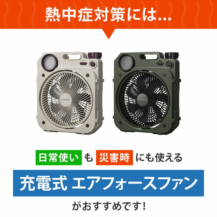 【充電式薄型送風扇 Air Force Fan】は普段使いはもちろん、停電時にも頼りになるファンです。 停電時の備えといえば、「安全のための灯りの確保」「情報収集のための電源の確保」が重要と言われておりますが、 近年の過酷な猛暑により、「夏場において停電時でも涼を取る手段」が求められるようになりました。 「Air-Force Fan」は、上記の3つの備えをカバーできる製品です。 【熱中症対策にもおすすめ】 近年熱中症によって救急搬送されるケースが増加しております。 熱中症は屋外だけではなく、屋内でも発症する恐れがありますので、エアフォースファンなどの送風扇風機を利用して熱中症対策をしっかり行いましょう。 【使う場所を選ばない充電式&コンパクトサイズ】 充電式でフル充電(電気代1.6 円)で最長約37時間の使用可能。 薄さ7.5cm!日常的に便利に使えるスリム&コンパクトなファン。 コンセントなど家庭用電源のない場所、設置場所に困る狭い場所でもお使いいただけます。 【自動首振り機能&縦置き・横置き自由】 90°の自動首振りや縦置き・横置きにも対応しており自由自在に風の流れを作ります。 室内干しの衣類乾燥にもおすすめです。 【DCモーター搭載の静音設計】 就寝時やテレビや音楽、読書でのくつろぎの時間もファンの音が気になりません。 ・最弱時:30db(鉛筆の筆記音、深夜の住宅街) ・最強時:45db(静かな住宅地や深夜の街中・図書館内) (※ファンから50cm離れた位置にて計測) 【いざという時には非常用電源になる!】 大容量バッテリー搭載なので非常用電源としてもお使いいただけます。 災害時、情報収集に必須のスマートフォンの充電が可能。 USB-A とUSB-Cの2種類の出力端子でスマートフォンを2台同時に充電できます。 【停電時の灯りに!】 LEDライト搭載で灯りの確保ができます。 明るさは3段階に調整可能です。 弱で80時間、強で20時間の長時間使用可能。 弱の低輝度では柔らかい光で長時間使用に適しており、強の高輝度では部屋全体を照らすのに適しています。 ライトが点滅することでモールス信号のSOSを発信するSOSモードも搭載しています。 【商品詳細】 【カラー】 ・クリームベージュ ・モスグリーン 【本体サイズ】 外形寸法:(約) 幅237mm×奥行75mm×高285mm 【本体質量】 (約)1.12kg 【材質】 ABS樹脂 【電源】 方式:充電式、リチウムイオン電池 29.6Wh(3.7V/8000mAh) 【入力・充電端子】 USB-C 5V/3A 【充電時間】 約5時間 【消費電力】 最大18W 【送風】 ・モーター:ブラシレスDCモーター ・羽根径:17cm、羽根枚数:7枚 ・風量調整:無段階調整 ・動作時間:弱:(約)37時間、強:(約)4時間 ・自動首振り:約90°(左右それぞれ45°) 【LEDライト】 ・調光:3段階+SOSライト ・動作時間:弱:(約)80時間、強:(約)20時間 ・消費電力:弱:(約)0.5W、強:(約)2W 【USB送電】 ・電池容量:3.7V/8000mAh ・出力端子:USB-C 5V/2A×1、USB-A 5V/2A×1 ※同時使用時合計2A 【安全機能】 自動電源OFF機能(充電時:50-55°C、動作時:55-60°Cを超えた場合に作動) 【USBケーブル】 ・端子|USB-A、USB-C ・コード長さ:(約)1m 【ACアダプタ】 ・最大外形寸法:幅(約)47mm×高(約)23 mm×奥(約)40mm ・質量:(約)38g ・定格入力:AC100V 50/60Hz ・定格出力:DC 5V/2A 【セット内容】 本体、USBケーブル、ACアダプタ、取扱説明書 【生産国】 中国 ※製品の仕様及び外観は性能向上等の理由から予告無く変更する場合がございます。 【関連キーワード】 送風 ファン 小型 充電式ファン Air Force Fan 熱中症対策 自動首振り 静音 軽量 扇風機 サーキュレーター スマホ充電可能 アウトドア キャンプ LEDライト搭載 衣類乾燥 コンパクト スリム ベージュ グリーン クマザキエイム リビング キッチン 脱衣所 トイレ メーカー希望小売価格はメーカーサイトに基づいて掲載しています。