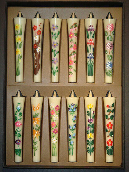 品 名 花蝋燭 四季の花 12本セット 入 数 12本入り 原 材 料 ハゼの実 ローソクサイズ 長さ 10cm(芯を入れて) 紙箱サイズ 横16.6cm×縦23.0cm×高さ2.5cm 燃焼時間 約 80分 のし・包装につきましてはこちらをクリック和蝋燭 花ろうそく 四季の花 花ろうそくは、古い昔から冬の間、 仏にお供えする仏花の代わりとして「花ろうそく」は生まれたと言い伝えられ 火をともし消え行く花ろうそくの「花」は仏に届くとものと聞きます。 手書きのぬくもりを伝える逸品! 是非手にとってお試しください。 四季の花ろうそくは九州産の「ハゼの実」を使用して手書きにて描く逸品。 12本セットは、1月から12月までのお花で、日本の四季を表現しています。 お供えのお品としてはもちろん、 純日本的な花柄なので「プレゼント」にも最適です。 海外の方へのお土産にも喜ばれていますのでオススメです。 高級な黒の紙箱入り ギフト包装(仏事・慶事・贈答)も無料にて受け賜ります。 注文時にお書き頂ければ、用途に応じてラッピングをさせていただきます。 また のし もお付けできます。 下記、プルダウンにてお選びください。 1月 すいせん 2月 梅 3月 すみれ 4月 さくら 5月 あやめ 6月 あじさい 7月 朝顔 8月 ゆり 9月 コスモス 10月 りんどう 11月 菊 12月 椿 ※贈答用蝋燭のお届けの際は文中の「線香」は修正させていただきます
