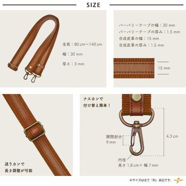 日本製 ショルダー持ち手 約80〜140cm 1本手 YAT-1439 メール便不可 《 約3cm幅 細身 合成皮革 アクリルバーバリーテープ スマホ ポシェット ショルダー 単品 ストラップ レザー 付け替え 合皮 ナスカン 長さ調整可 バッグ 手芸 ハンドメイド YAT1439 携帯ショルダー