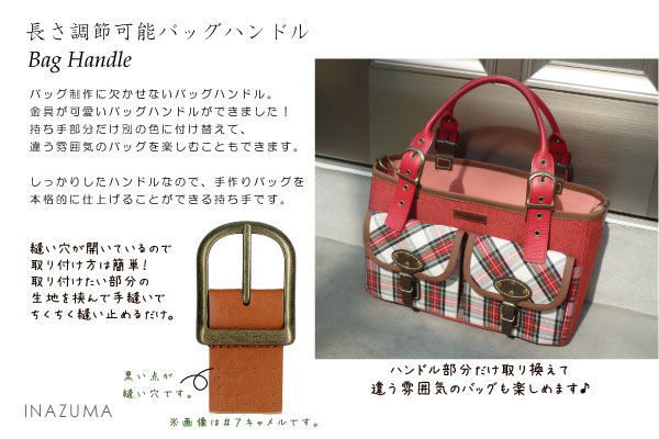 バッグ制作に欠かせないバッグハンドル。 仕上がりをぐんと完成度の高いものに変身させます。仕様 入数 2本 素材 合成皮革 注意点 他店舗と同一在庫のため、在庫切れの場合がございます。 お急ぎの方は在庫確認をしていただくなどお願いします。 厚みがあるため、メール便では送れません。 サイズ 全長約42〜62cm 持ち手部分の幅8mm(横から見た幅は約1.2mm) テープ部分の幅約30mm ※全長は、バッグに取り付けるあて布部分からあて布部分までの長さです。 関連商品 長さ調節可能バッグハンドル(アクリル×合成皮革) 幅30mm 長さ調節可能バッグハンドル(合成皮革) 幅30mm