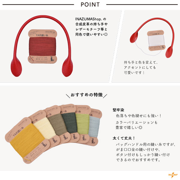 INAZUMAの合成皮革の持ち手やパーツと同色で使いやすくカラーも豊富です。 縫い付けタイプの口金を縫い付けるのにも適しています。 縫い針には、フランス刺しゅう針No.3を推奨しています。商品の説明 素材 ポリエステル100%(堅牢染め) 入数 1色1枚 サイズ 太さ5番 / 20m巻 注意点 手縫い糸のため、ミシンではご利用いただけません。 ※メール便可 他店舗と同一在庫のため、在庫切れの場合があります。 お急ぎの方は在庫確認後にご注文下さい。 他の商品と一緒にご注文をいただいた場合でも、 全て揃ってからの商品発送となりますのでご了承下さい。 関連商品 メディア掲載