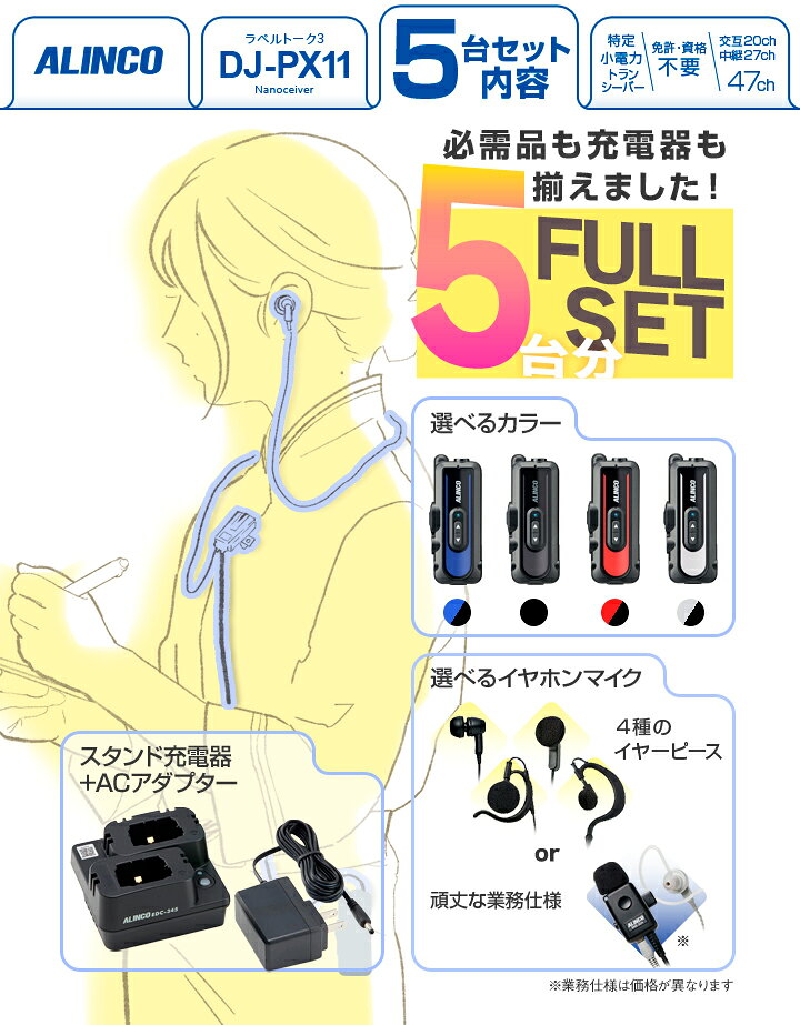 【5台フルセット】アルインコ DJ-PX11 5台フルセット 特定小電力 トランシーバー ( +純正マイク×5 EDC-345A×3) / IP67 コンパクト 小型 軽量 飲食業 クリニック 介護 DJ-PX11B DJ-PX11A DJ-PX11R DJ-PX11S EME-