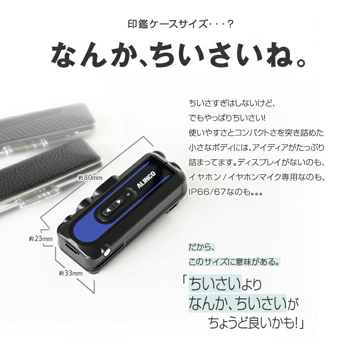 ●当店の扱うインカム・トランシーバーは電波法を遵守した商品です。 インカムアゲインでは、技適マーク(電波法で定められる技術基準に適合した無線機を証明するためのマーク)が表示された無線機のみを取り扱っており、これまで販売した商品もすべて適法です。ご安心くださいませ。なお、電波法に違反する無線機・インカム・トランシーバーを使用する行為は、周辺のすべての電波へ影響を与えうる行為で 使用者のみ が罪に問われます。皆さまのためにも、安心できるショップから技適証明のある商品だけをご購入ください。 資格・免許不要 (特定小電力トランシーバー/技術基準適合認証済) 交互通話用20Ch+中継用27Ch対応(中継機対応) 【おすすめ職業】 業務中にインカムを目立たせたくない、繊細な接客が求められる業務用にも。 クリニック、歯科医院、介護職、美容院、倉庫業 など 【他機種/新旧モデルをお持ちの方に】 特定小電力トランシーバーは 新旧モデル、他機種・他メーカー同 士でも通話可能です 。 ※ ただし、機種・アンテナが揃うと最も安定した運用ができ おすすめです。もしも他機種を混用する場合「チャンネル/グループ設定」「特殊機能の設定有無」、そして特に「機種固有の通信範囲の差」にはご注意ください。 ※ 詳細はお問い合わせいただくと確実です。 【特徴】 USB typeCで充電できる手軽さ 小型で軽量なボディ アンテナを内蔵することですっきりコンパクト ラペルトークシリーズ初のイヤホンマイク装着 IP66 / 67 の高い防塵防水性能 アプリから bluetooth 接続して設定できる(スタンド充電器使用の場合) DJ-PX11は従来機のDJ-PX10より一回り大きいサイズ感です。それでも十分に小型なのがアルインコの凄いところ。大きくなったことで重心が変わり、胸ポケットや襟元につけた時の着け心地が改善されました。 さらにストロングポイントとして、USB TypeCでの充電が可能になりました。お手元の充電器でも充電できるという手軽さに導入へのハードルも低くなりそうです。 防塵防水機能はねじ式プラグの採用に強化された筐体設計を備えた結果、IP66/67と高水準。この小ささに安心感まで与えられた言うことなしの使い心地。 また、追加された機能として、イヤホンマイクを装着できるようになりました。襟元で本体をイヤホンマイクのように使用する従来のやり方に加え、イヤホンマイク装着でポケットに収納してしまえばふくらみも目立たず、ご使用いただけます。 なおDJ-PX10/DJ-PX5との充電器、イヤホンの互換性はありませんが、通信範囲が許せば従来機を混ぜての運用も可能です。通信距離は狭めですが、開けた室内店舗であれば問題なく使えます。ご不安があればサポートセンターにご連絡ください。デモ機の貸し出しも行っています。 ※イヤホン/イヤホンマイク専用モデルです。イヤホン/イヤホンマイクは別売りとなっておりますので、別途ご購入ください。本体スピーカーを搭載しないため、イヤホンがないと通話ができません。 ※バッテリー内蔵。充電器/ACアダプター/USBケーブルは別売り。 DJ-PX11・専用スマホアプリの詳細な操作方法等はこちらから>電子取扱説明書(PDF)が開きます ▼ 機種対応オプションはこちら ▼ ※セット商品・通常同梱品以外、すべてのオプションは別売りです。