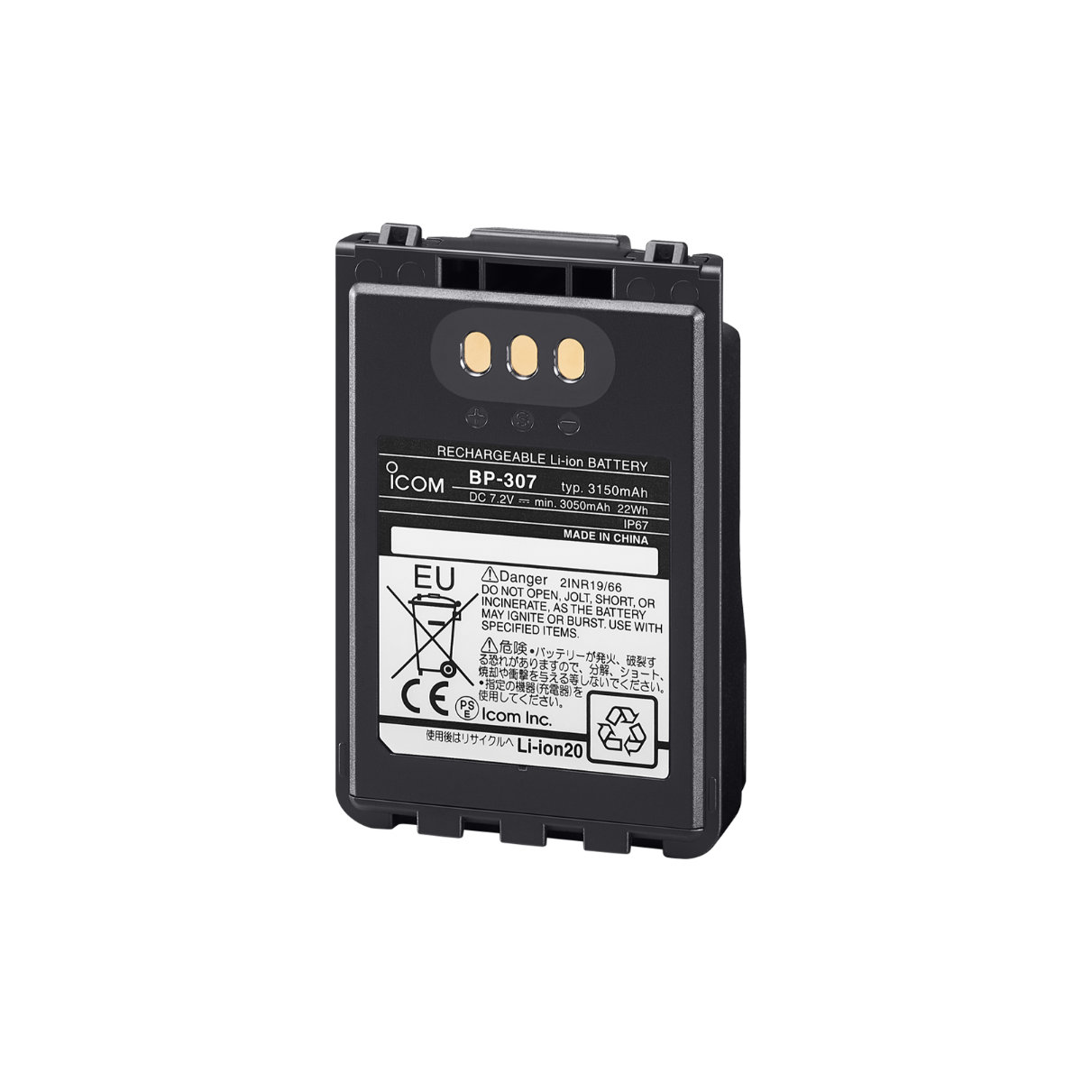 IC-705,ID-52,IP502H,IP501H用の大容量リチウムイオンバッテリーパック 仕様 電圧:7.2V 電流容量(min) :3050mAh 電流容量(typical) :3150mAh 防水性能:防水(本体が防水仕様の場合) ご注意:BC-202でもBP-307の充電は可能ですが十分な充電はできません。