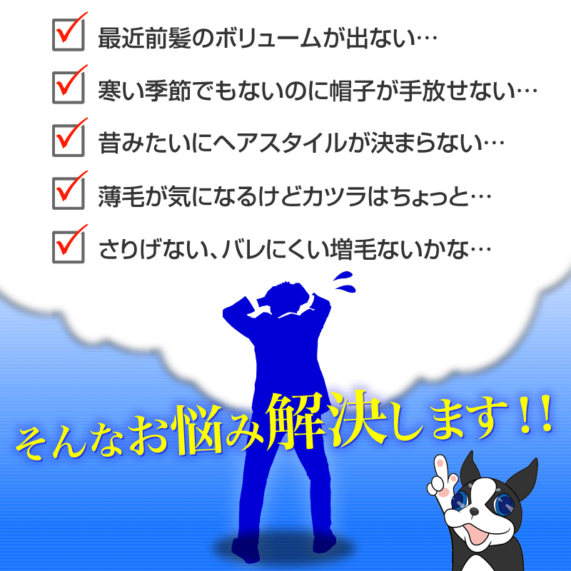 特徴 ○ ヘアーインプラントM字部用は裏面のフィルムをめくるだけの簡単装着できる増毛シートです。定着期間も1~2週間と非常に長く価格ももちろん適正価格で経済的です。 ○ 自宅でできる画期的な頭皮一体増毛。 ○ 強力な両面テープで装着。 ○ そのままシャンプー・セットがOK。触られても気づかれません。 ○ 1本1本丁寧に増毛してあり濡れても自然さ抜群・連続使用1?2週間可能。 ○ 必要部分だけ使用ができる型取りシート付き。 ○ 専用の再生剤を使用すると周りのめくれてきたところのセルフメンテナンスも可能です。(別売り) サイズ M字部分用は幅5.5cm奥行き3.5cmのサイズで一般的なM字部分の形 サイズ表を見る 付属品 ヘアーインプラント左右各1枚ずつ・取扱説明書・シングルピン1個・リングコーム・取外用アルコールシート ▼サイズ比較表!M字部用がフィットするかも!?▼