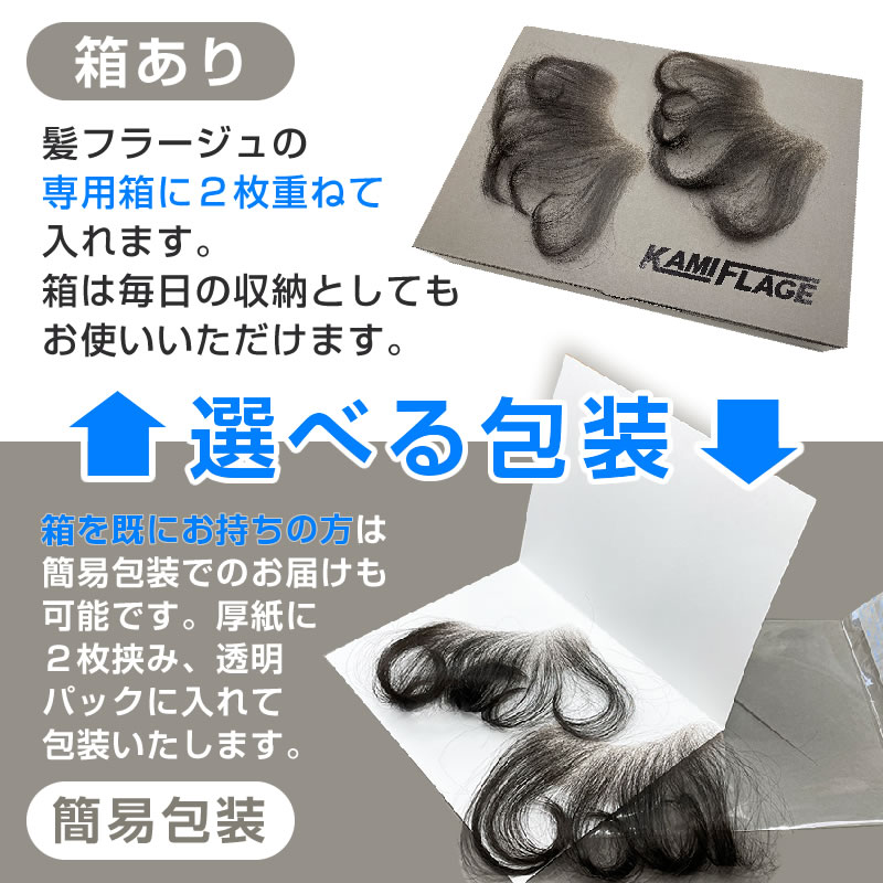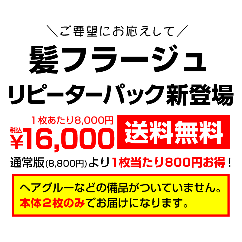 髪フラージュのお得なリピーターパックです。 本体2枚入りになります。 ※ヘアグルーなどの備品は付属していません。必要な方は別途ご購入お願いいたします。 【スペック】 毛の長さ:約12~13cm(カール) 毛量:約2700本 カラー:1色。ダークブラウン 【パッケージ内容】 ・髪フラージュ本体2枚 【注意事項】 ・取外しの際は必ず、お湯で優しく外して下さい。無理に剥がしてしまうと、ネットの破損につながります。 ・装着は必ず、ヘアグルー(別途購入)を使って下さい。 ・インターネット通販限定の商品です。実店舗にリピーターパックはございません。