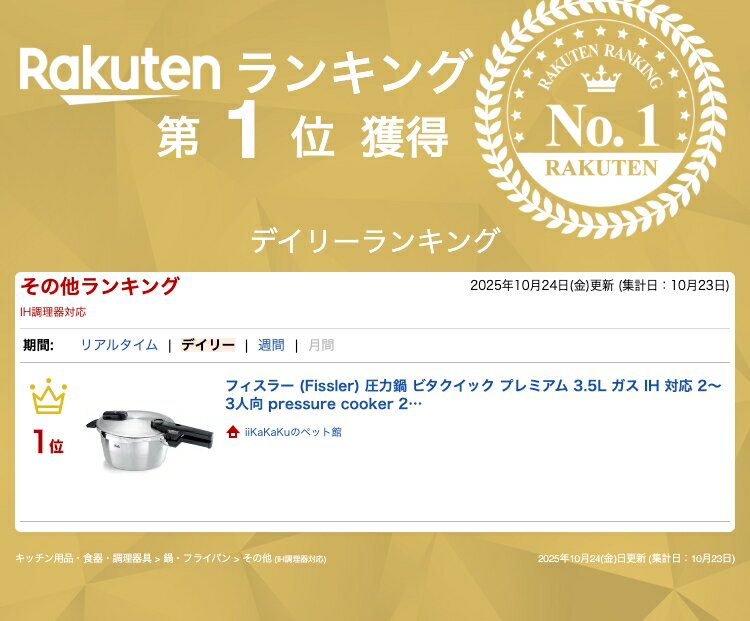 ブランド Fissler(フィスラー) 容量 3.5 リットル 材質 ステンレス鋼 色 シルバー 商品の寸法 43奥行き x 25幅 x 15高さ cm この商品について 本体サイズ(内径×取っ手間距離×フタ込み高さcm):22×43×15 本体重量(kg):2.7 素材:ステンレス(本体・フタ・底)、アルミニウム(底)、シリコーン(フタ)、合成樹脂(フタ・取っ手) 対応熱源:ガス火・電磁調理器(IH 100V/200V対応)・電気コイル・ハロゲンヒーター 生産国:ドイツ 【2段階の圧力設定】食材やお好みの仕上がりに応じて低圧・高圧の2段階の圧力設定が可能。低圧は魚などのやわらかい食材・プリン・茶碗蒸しの調理に、高圧は肉料理・煮込み料理など料理全般に適しています。 【設計】蒸気が少なく、音も静かなフィスラーの圧力鍋。正しくロックされない限り圧力がかからない安全仕様、より大きくつかみやすい形状になった補助取っ手、高品質ステンレスを使用したサテン仕上げの美しいボディ。 【時短料理】圧力鍋を使用することでカレーや煮物など時間がかかる料理も、栄養を逃さず時短で簡単に調理が可能。IH,ガス火の両方に対応しています。 商品の説明 時短・簡単・そしてヘルシー。フィスラー圧力鍋のエントリーモデル。蒸気が少なく音も静かなフィスラーの圧力鍋 ビタクイック プレミアムと、健康的な料理が時短で簡単に、しかも安心・安全、そして省エネの圧力調理の世界へ。 商品画像は、ご使用のモニタ端末などによって、色合い、質感などが実際のものと多少異なって見える場合があります。 ご注文およびご入金のタイミングにより、稀に在庫欠品となる場合がございます。 欠品の場合は、ご注文をキャンセルさせて頂きます。何卒こ了承くたさい。 複数ご購入頂いた場合は、発送方法が変更になる場合がございます。 住所に不備があるとお届けできません。送付先不明による商品引き戻し、再発送の際の費用は、 お客様の負担となります。 ご不便をおかけいたしますが、何卒ご了承いただきますようお願い申し上げます。