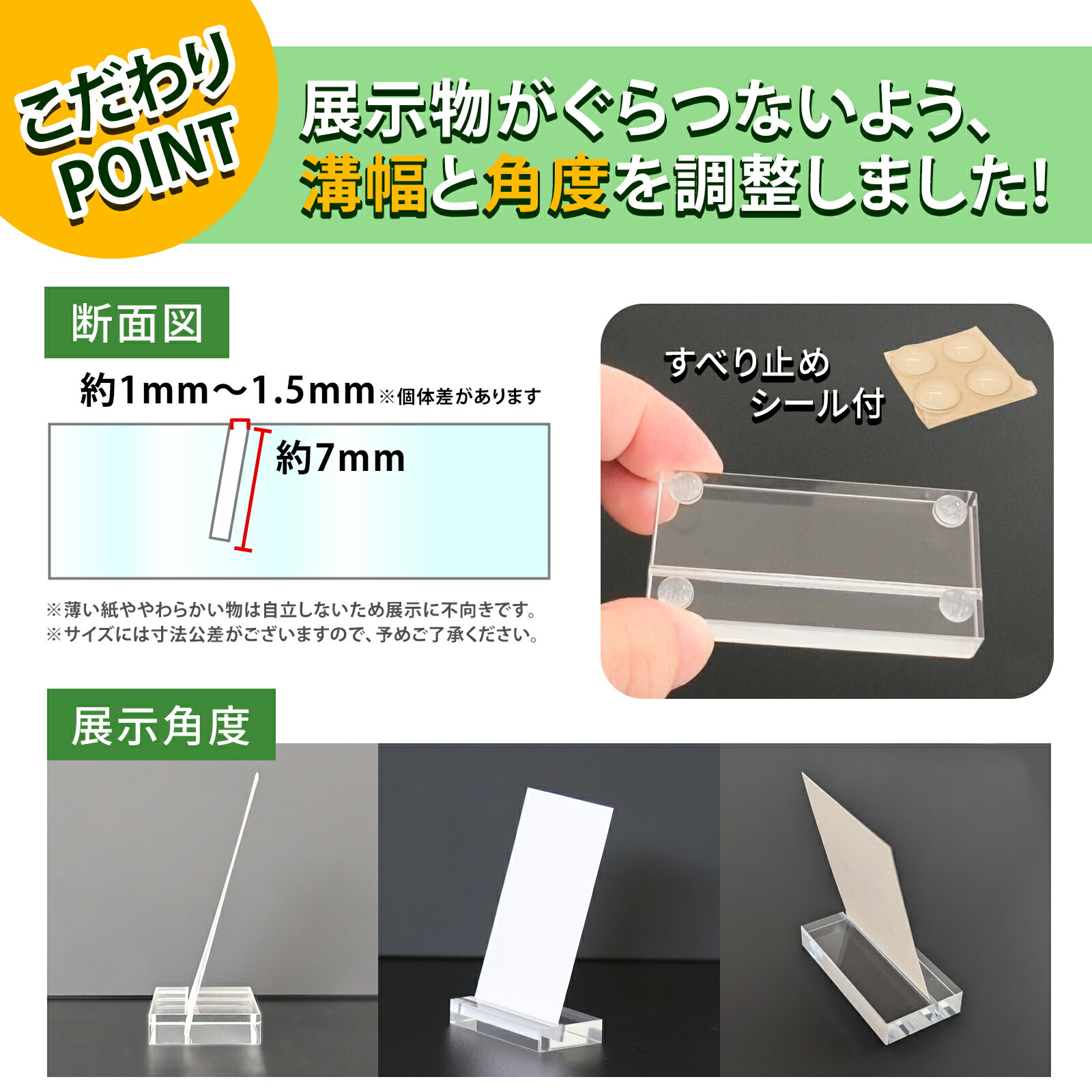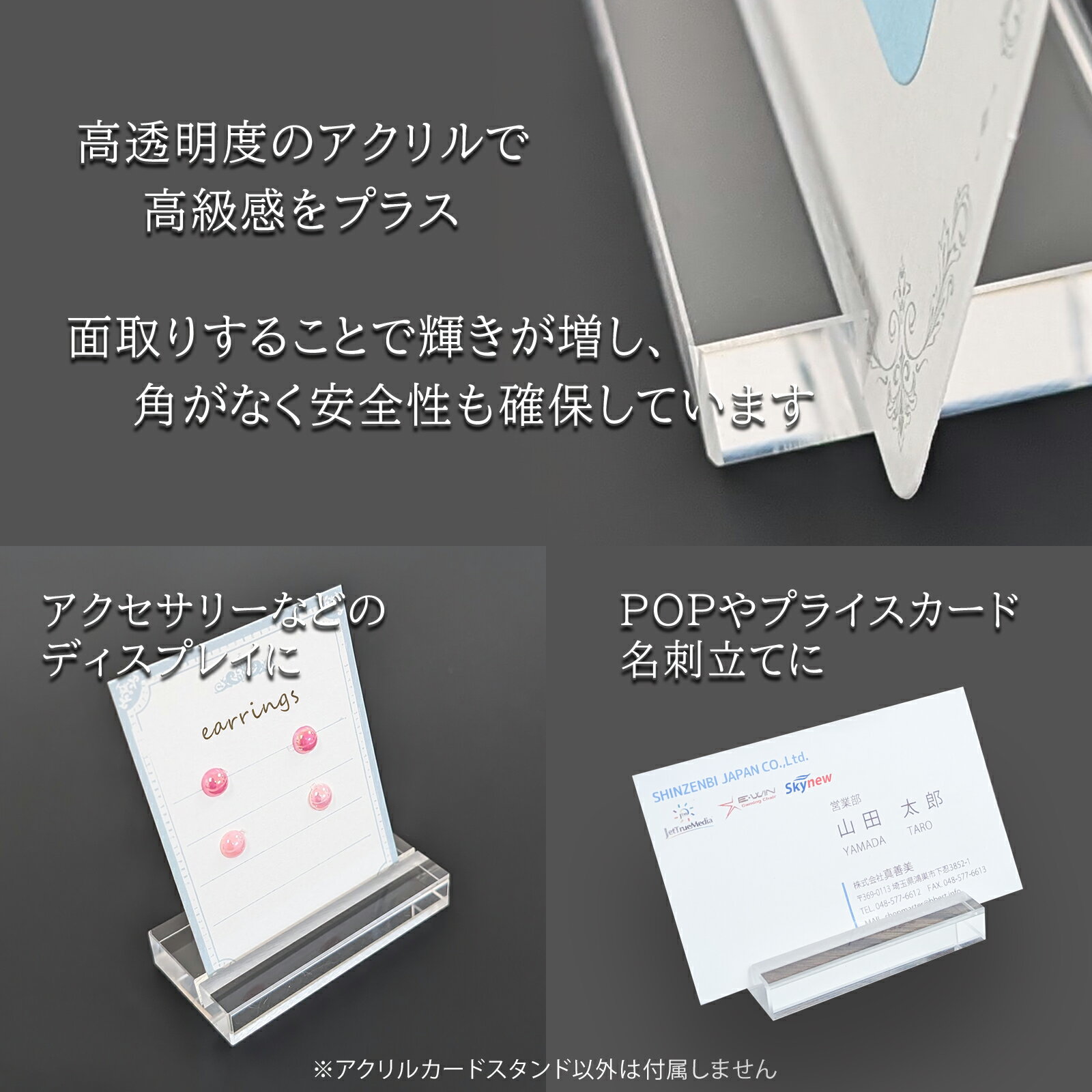 【高級感と安定感を兼ね備えたアクリルカードスタンド】 高透明度アクリルを使用したカードスタンド。 POPスタンドや名刺立てとしても活躍。 面取り加工により輝きが増し、角がなく安全性も確保。 差し込み口の幅(約1~1.5mm)と角度を調整し、展示物がぐらつかず安定して設置できます。 滑り止めシール付きで、卓上でのずれや傷も防止。 【POP・値札・アクセサリー展示に最適】 プライスカード、POP、名刺、アクセサリーなどの展示に対応。差し込み口の深さは約7mmで、しっかりと固定可能。 L判写真も展示できるサイズ感で、店舗什器や展示用品としてもおすすめ。 ※薄い紙や柔らかい素材には不向きです。 【店舗・イベント・展示会におすすめ】 店舗ディスプレイやイベント、展示会での使用に最適。 高級感のある見た目で、展示物の魅力を引き立てます。 1パック6個入りでコストパフォーマンスも抜群。 業務用にも個人利用にも対応可能なアクリルスタンドです。 【見せたいものを美しく、安定して展示】 サイズは約6×3×1cmで、名刺サイズ(91×55mm)に対応。 透明感のあるアクリルが展示物を美しく引き立て、滑り止めシールで安定性も確保。 POPスタンドやカード立てとして、展示の目的に応じて安心して使えるアイテムです。 商品名 アクリルカードスタンド 6個セット 型番 ACS-CL 商品サイズ 本体:60mm×30mm×10mm溝:1.5mm×7mm 材質 アクリル 同梱品 滑り止めシール高透明アクリルで魅せる、安定感抜群のカードスタンド POP・名刺・アクセサリー展示に最適なアクリルカードスタンド。 面取り加工で高級感と安全性を両立。 差し込み口は約1~1.5mmで展示物がしっかり安定。 滑り止めシール付きで卓上でもズレにくい設計。 6個セットでコスパも抜群、店舗什器や展示用品におすすめ。