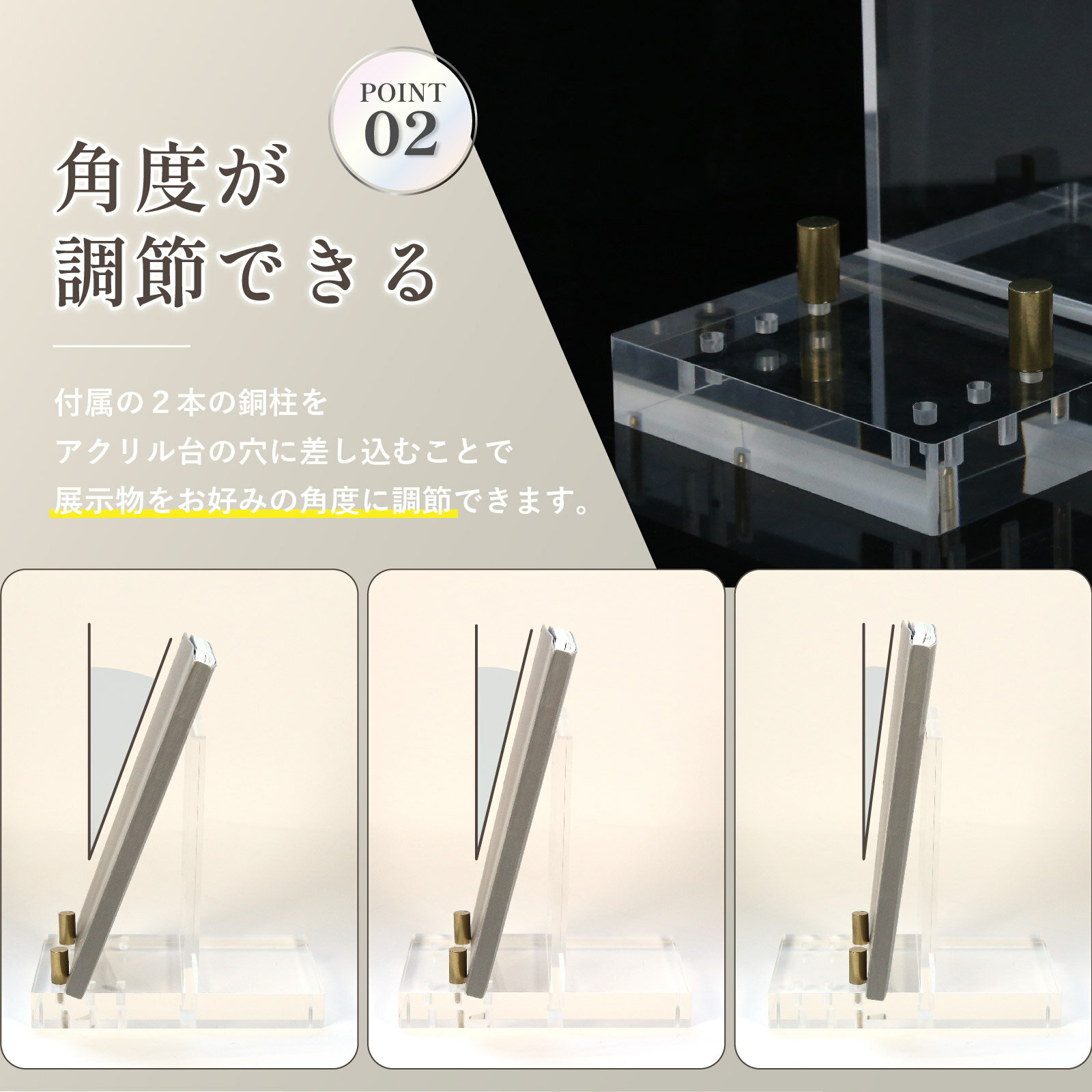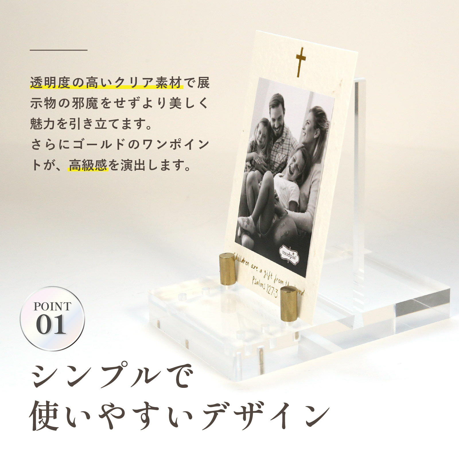 【高級感と透明感を兼ね備えたアクリルディスプレイスタンド】 ガラスを凌ぐ光線透過率を誇るクリアアクリル素材に、ゴールドの真鍮支柱を組み合わせることで、 展示物の魅力を最大限に引き立てます。 角度調整可能で、スマホ・タブレット・本・メニュー表など多様なアイテムに対応。 すべり止めシール付きで安定感も抜群。組立式でコンパクト収納が可能な、おしゃれで実用的な卓上スタンドです。 【幅広い用途に対応する多機能スタンド】 スマホスタンド・タブレットスタンド・ブックスタンド・メニュースタンドとして、 店舗ディスプレイやイベント、フリーマーケット、マルシェ、ウェルカムスペース、オフィスなど、あらゆるシーンで活躍。 POPやカタログ、商品展示にも対応し、什器としても優秀です。 結婚式の写真スタンドとしてもおすすめ。 【ショップ運営者や個人ユーザーにもおすすめ】 ショップ運営者、イベント出展者、企業の販促担当者、 オフィスでの資料展示を行う方、ご自宅でおしゃれにアイテムを飾りたい方に最適。 高級感と実用性を兼ね備えたディスプレイスタンドをお探しの方にぴったりです。 【展示物を美しく安定して魅せる設計】 展示物を美しく、安定して見せることを目的とした設計。 角度調整機能により、視認性を高め、来店者や来場者の目を引くディスプレイを実現。 簡単な組み立て式で、設置もスムーズ。持ち運びや収納にも配慮された設計で、使い勝手の良さも魅力。 アクリルスタンド・ディスプレイ什器として、長く使える一品です。 商品名 アクリルディスプレイスタンド 本体サイズ(約) W101×D153×H154.4 mm 重量(約) 495g 材質 アクリル、銅高級感と実用性を兼ね備えた多用途ディスプレイスタンド 透明度の高いアクリル素材とゴールドの支柱が展示物を美しく演出。 スマホ・本・メニュー表など幅広く対応し、角度調整も可能。 すべり止め付きで安定感抜群、組立式で持ち運びもラクラク。 店舗・イベント・結婚式・オフィスなど多彩なシーンで活躍。 おしゃれで機能的な卓上スタンドをお探しの方におすすめ。