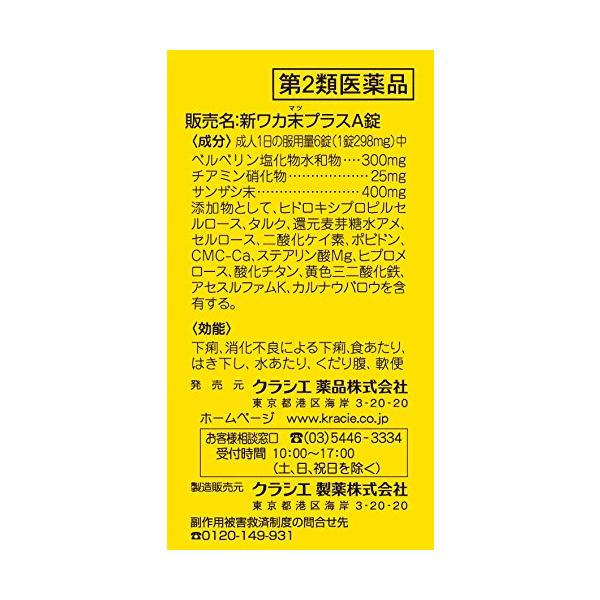 使用上の相談点1.次の人は服用前に医師、薬剤師又は登録販売者に相談してください (1)医師の治療を受けている人 (2)発熱を伴う下痢のある人、血便のある人又は粘液便の続く人 (3)高齢者 2.5?6日間服用しても症状がよくならない場合は服用を中止し、この文書を持って医師、薬剤師又は登録販売者に相談してください効能・効果下痢、消化不良による下痢、食あたり、はき下し、水あたり、くだり腹、軟便成分・分量成人1日分6錠(1錠298mg)中、次の成分を含んでいます。 ベルベリン塩化物水和物(局)・・・300mg (下痢止(抗菌、腸内腐敗発酵による有害物質の産生抑制、腸管運動抑制、胆汁分泌促進作用)) チアミン硝化物(局)(ビタミンB1)・・・25mg (ビタミンB1の補給) サンザシ末・・・400mg (消化促進による下痢止) 添加物として、ヒドロキシプロピルセルロース、タルク、還元麦芽糖水アメ、セルロース、二酸化ケイ素、ポビドン、CMC?Ca、ステアリン酸Mg、ヒプロメロース、酸化チタン、黄色三二酸化鉄、アセスルファムK、カルナウバロウを含有する。使用上の注意点?商品詳細塩化ベルベリンを主成分とした下痢・食あたり・水あたり・軟便などに効果がある下痢止です。保管及び取扱上の注意点(1)直射日光の当たらない湿気の少ない涼しい所に密栓して保管してください。 (2)小児の手の届かない所に保管してください。 (3)他の容器に入れ替えないでください。 (誤用の原因になったり品質が変わります。) (4)ビンの中の詰物は、輸送中に錠剤が破損するのを防ぐためのものです。 開栓後は不要となりますのですててください。 (5)使用期限のすぎた商品は服用しないでください。 (6)水分が錠剤につきますと、変色または色むらを生じることがありますので、誤って水滴を落としたり、ぬれた手で触れないでください。用法及び用量次の量を1日3回食後服用する。 成人(15才以上)・・・1回量2錠、1日服用回数3回 8才以上15才未満・・・1回量1錠、1日服用回数3回 8才未満・・・服用しないこと 【用法・用量に関する注意】 小児に服用させる場合には、保護者の指導監督のもとに服用させてください。商品サイズ高さ76mm×幅41mm×奥行き41mm剤型・形状フィルムコーティング錠問合せ先クラシエ薬品株式会社 お客様相談窓口 〒108?8080 東京都港区海岸3?20?20 03?5446?3334