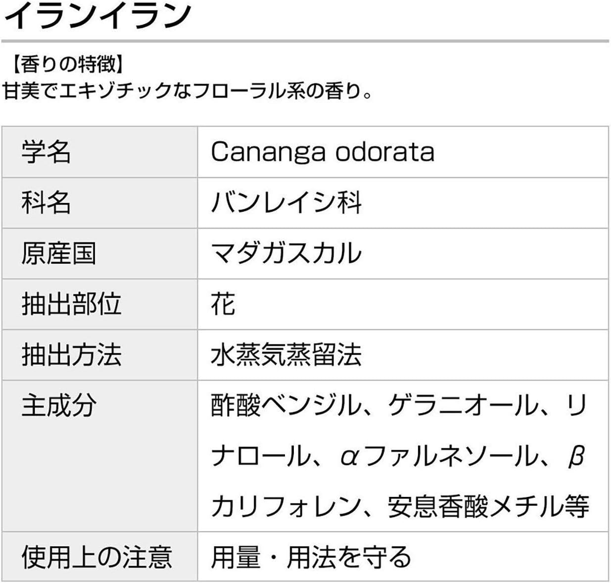 アロマテラピー アロマセラピー アロマ アロマオイル エッセンシャルオイル 精油 アロマディフューザー アロマ加湿器 アロマランプ 癒し リラクゼーション 抗菌 消臭 AEAJ 公益社団法人日本アロマ環境協会 表示基準適合認定精油 【イベントキーワード】ギフト プレゼント 贈り物 GIFT 高品質 おすすめ オススメ お勧め 香りが良い 香りがよい 強い 人気あす楽対応商品 翌日 翌日配送イランイラン【香りの特徴】甘美でエキゾチックなフローラル系の香り 学名 Cananga odorata 科名 バンレイシ科 原産地 マダガスカル 抽出部位 花 抽出方法 水蒸気蒸留法 主成分 酢酸ベンジル、ゲラニオール、リナロール、αファルネソール、βカリフォレン、安息香酸メチル等 ノート ミドル〜ベース 使用上の注意 用量・用法を守る/高濃度での使用は控える/皮膚刺激に注意 ボトルサイズは下記よりご選択ください 5ml 10ml 50ml 100ml 1000ml ※エッセンシャルオイル(精油)は天然植物から抽出されるため、 ロットや季節・天候により色調や香りに違いが生じる場合があります。 また環境等により、濁りや沈殿物が生じる場合がありますが、 品質に問題はありませんので、安心してご使用ください。 ※時期により原産国が予告なしに変更になる場合があります。 ※ガラス製ボトルの厚みに個体差があるため、液面の高さに違いが生じる場合が あります。予めご了承ください。 ※色の濃いエッセンシャルオイル(精油)は、衣服や家具等に付着すると シミの原因となる可能性がございますので、ご注意ください。