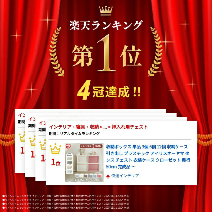 ※2025年1月16日新カラー追加しました! ※2025年4月10日単品・6個セット・12個セット追加しました! ※2025年5月リニューアル チェストの引き出しの左上のアイリスマークが削除されました ■セット数【選べる】単品・3個セット・6個セット・12個セット■商品サイズ(cm)幅約39×奥行約50×高さ約29.7■引出内寸(cm)幅約32.7×奥行約45×高さ約24.4■内容量約37.4L■主要材質ポリプロピレン■収納の目安Tシャツなら18枚、セーターなら6枚、バスタオルなら10枚■2025年1月15日リニューアルしました!・カラー:ピンクベージュ/ブルーグレーを追加BCチェスト/組み立て不要/たっぷり収納好みの色に合わせて収納をカスタマイズ◆クローゼットにピッタリ収まる深型/Lサイズ 奥行約50cmクローゼットの平均的な奥行は約45〜60cm。BCチェストは奥行約50cmと、ちょうど良いサイズ感。◆積み重ねて収納力を大幅UP3段まで積み重ねて使用可能。ハンガー下のスペースも有効活用できます。◆ベッド下収納にもおすすめ落ち着いたカラーで生活感を抑えつつ、デッドスペースを有効活用。[検索用:3個セット 収納ボックス 収納ケース 引き出し プラスチック タンス チェスト 衣装ケース クローゼット 50cm 奥行50cm 完成品 おしゃれ チェスト 深型 セット クリア収納 クリアケース 一人暮らし 衣類収納 奥行50 省スペース 4967576203548 4967576534536 4967576534543 4967576534574 4967576534550 4967576534567 4967576706438 4967576706445 4967576773133 4967576773140] 最強翌日配送対象商品に関するご案内 最強翌日配送対象商品・対象地域に該当する場合は最強翌日配送マークがご注文カゴ近くに表示されます。 最強翌日配送可能なお支払方法は【クレジットカード、代金引換、全額ポイント支払い】のみとなります。 下記の場合は最強翌日配送対象外となります。 15点以上ご購入いただいた場合、 時間指定がある場合、 ご注文時備考欄にご記入がある場合、 決済処理にお時間を頂戴する場合、 郵便番号や住所に誤りがある場合、 最強翌日配送対象外の商品とご一緒にご注文いただいた場合、 お届け先住所文字数が40文字以上の場合 関連キーワード(本商品の説明ではありません)母の日 父の日 敬老の日 こどもの日 クリスマス バレンタイン ホワイトデー ハロウィン お正月 成人の日 成人式 記念日 誕生日 卒業式 入学式 お歳暮 お中元 春 夏 秋 冬 梅雨 節分 ひな祭り 七夕 十五夜 初詣 年越し 夏祭り 花火大会 結婚祝い 内祝い 出産祝い 快気祝い 還暦祝い 古希 喜寿 傘寿 米寿 卒寿 白寿 百寿 新築祝い 引っ越し祝い 開店祝い 開業祝い 就職祝い 昇進祝い 合格祝い 銀婚式 金婚式 七五三 長寿祝い 御礼 お母さん お父さん 義母 義父 祖父 祖母 おばあちゃん おじいちゃん 娘 息子 彼氏 彼女 恋人 友達 上司 先輩 後輩 同僚 キッズ 子供 幼児 ベビー 赤ちゃん 育児 学生 社会人 シニア 10代 20代 30代 40代 50代 60代 70代 80代 90代 一人暮らし 単身赴任 主婦 主夫 新生活 家族暮らし 子育て 旅行 トラベル ライブ ホームパーティ ビジネス 法人 ギフト プレゼントご注文前のよくある質問についてご確認下さい[ FAQ ] タンス・チェストランキング おすすめ商品 〜人気No.1〜 〜人気No.2〜 〜人気No.3〜 タンス・チェストをキーワードから探す▶人気No.1▶完成品▶大容量▶北欧▶キャスター付き▶白▶おしゃれ こちらもオススメ 【2個セット】ウッドトップチェスト 収納ケースふた付き 段ボール収納 レビューキャンペーンレビュー投稿でもれなく全員に 次回使える5%OFFクーポンをプレゼント!※投稿が確認でき次第、ご登録のアドレスへクーポンURLをお送りします。