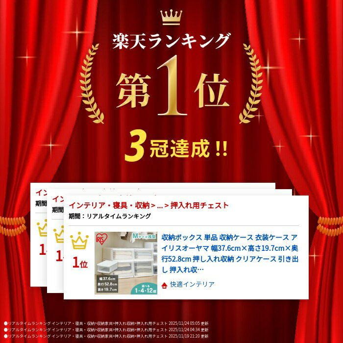 ※リニューアルに伴い、製品サイズ高さ約18.5cmでございます。 一部商品POPに【製品サイズ高さ約19.7cm】と記載がある商品が届く場合がございます。 何卒ご了承頂けます様お願い申し上げます。 ■商品サイズ(cm):幅約37.6×奥行約52.8×高さ約18.5 ■重量:約1509g ■引出内寸(cm):幅約32.5×奥行約46.3×高さ約15 ■引出容量:23L ■数量:【選べる】単品/4個セット/12個セット ■積重ね可能段数:5段まで ■材質:ポリプロピレン ■原産国:中国 衣類や小物収納に便利なチェスト☆ 中身が見えるクリアタイプで、シーンを選ばず使えるシンプルなデザインです。 重ねた状態で引出しを引いた時の本体の傾き・持ち上がりを、天面に施した前倒れ防止加工が防ぎます。 使用シーンに合わせて選べる7サイズ展開です♪ ★お客様組み立て★ 2018/10/18 リニューアルしました! ≪変更点≫ ・型番:チェストE S → チェストI M に変更 ・商品サイズ(cm):幅約37.6×奥行約52.8×高さ約20→幅約37.6×奥行約52.8×高さ約19.7に変更 ・「重ねた状態で引出しを引いた時の本体の傾き・持ち上がりを防ぐ為、天面に前倒れ防止加工」を追加しました。 最強翌日配送対象商品に関するご案内 最強翌日配送対象商品・対象地域に該当する場合は最強翌日配送マークがご注文カゴ近くに表示されます。 最強翌日配送可能なお支払方法は【クレジットカード、代金引換、全額ポイント支払い】のみとなります。 下記の場合は最強翌日配送対象外となります。 15点以上ご購入いただいた場合、 時間指定がある場合、 ご注文時備考欄にご記入がある場合、 決済処理にお時間を頂戴する場合、 郵便番号や住所に誤りがある場合、 最強翌日配送対象外の商品とご一緒にご注文いただいた場合、 お届け先住所文字数が40文字以上の場合 関連キーワード(本商品の説明ではありません)母の日 父の日 敬老の日 こどもの日 クリスマス バレンタイン ホワイトデー ハロウィン お正月 成人の日 成人式 記念日 誕生日 卒業式 入学式 お歳暮 お中元 春 夏 秋 冬 梅雨 節分 ひな祭り 七夕 十五夜 初詣 年越し 夏祭り 花火大会 結婚祝い 内祝い 出産祝い 快気祝い 還暦祝い 古希 喜寿 傘寿 米寿 卒寿 白寿 百寿 新築祝い 引っ越し祝い 開店祝い 開業祝い 就職祝い 昇進祝い 合格祝い 銀婚式 金婚式 七五三 長寿祝い 御礼 お母さん お父さん 義母 義父 祖父 祖母 おばあちゃん おじいちゃん 娘 息子 彼氏 彼女 恋人 友達 上司 先輩 後輩 同僚 キッズ 子供 幼児 ベビー 赤ちゃん 育児 学生 社会人 シニア 10代 20代 30代 40代 50代 60代 70代 80代 90代 一人暮らし 単身赴任 主婦 主夫 新生活 家族暮らし 子育て 旅行 トラベル ライブ ホームパーティ ビジネス 法人 ギフト プレゼントくらしにプラス+ 最大400円OFFクーポン配布中利用期間:12月1日(月)0:00~12月7日(日)9:59クーポン獲得はこちら≫ ご注文前のよくある質問についてご確認下さい[ FAQ ] レビューキャンペーンレビュー投稿でもれなく全員に 次回使える5%OFFクーポンをプレゼント!※投稿が確認でき次第、ご登録のアドレスへクーポンURLをお送りします。