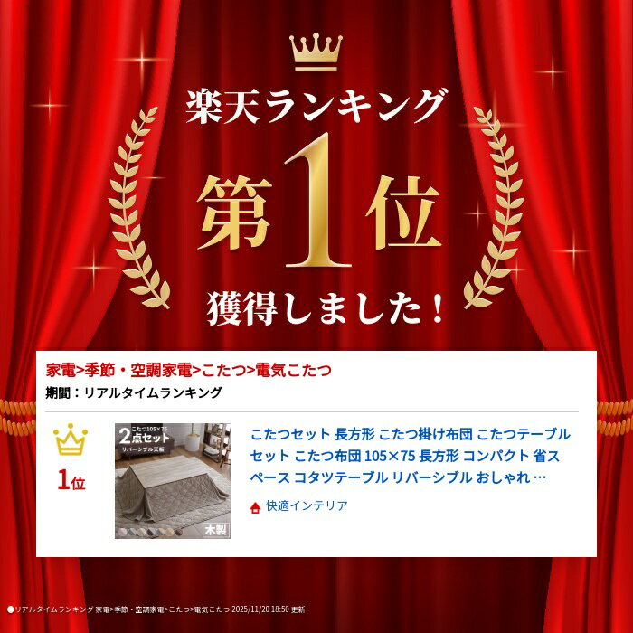 ●商品サイズ(cm) こたつテーブル:幅約105×奥行約75×高さ約36.3 省スペースこたつ布団:幅約155×奥行約125 ●商品重量 こたつテーブル:約24.5kg ●材質 ・こたつテーブル 天板:パーティクルボード 脚部:MDF ●ヒーター メトロ電気工業製 石英管ヒーター(300W) 品番:MS-303H 定格:AC100V 300W 50-60Hz 目盛り (強)1時間あたりの標準消費電力量 約160Wh 目盛り (弱)1時間あたりの標準消費電力量 約80Wh 安全装置 温度ヒューズ133℃ コード:電源スイッチ付き丸打ちコードタイプ3m メーカー保証1年 ●省スペースこたつ布団 詰めもの:ポリエステル100% ※下記、2023年9月12日にリニューアルになりました※ ●こたつテーブル 折れ脚タイプ→折れ脚ではないタイプ ●こたつ布団 表生地180g/m2フランネル→表生地200g/m2ストライプフランネル コーディロイ風 最強翌日配送対象商品に関するご案内 最強翌日配送対象商品・対象地域に該当する場合は最強翌日配送マークがご注文カゴ近くに表示されます。 最強翌日配送可能なお支払方法は【クレジットカード、代金引換、全額ポイント支払い】のみとなります。 下記の場合は最強翌日配送対象外となります。 15点以上ご購入いただいた場合、 時間指定がある場合、 ご注文時備考欄にご記入がある場合、 決済処理にお時間を頂戴する場合、 郵便番号や住所に誤りがある場合、 最強翌日配送対象外の商品とご一緒にご注文いただいた場合、 お届け先住所文字数が40文字以上の場合 関連キーワード(本商品の説明ではありません)母の日 父の日 敬老の日 こどもの日 クリスマス バレンタイン ホワイトデー ハロウィン お正月 成人の日 成人式 記念日 誕生日 卒業式 入学式 お歳暮 お中元 春 夏 秋 冬 梅雨 節分 ひな祭り 七夕 十五夜 初詣 年越し 夏祭り 花火大会 結婚祝い 内祝い 出産祝い 快気祝い 還暦祝い 古希 喜寿 傘寿 米寿 卒寿 白寿 百寿 新築祝い 引っ越し祝い 開店祝い 開業祝い 就職祝い 昇進祝い 合格祝い 銀婚式 金婚式 七五三 長寿祝い 御礼 お母さん お父さん 義母 義父 祖父 祖母 おばあちゃん おじいちゃん 娘 息子 彼氏 彼女 恋人 友達 上司 先輩 後輩 同僚 キッズ 子供 幼児 ベビー 赤ちゃん 育児 学生 社会人 シニア 10代 20代 30代 40代 50代 60代 70代 80代 90代 一人暮らし 単身赴任 主婦 主夫 新生活 家族暮らし 子育て 旅行 トラベル ライブ ホームパーティ ビジネス 法人 ギフト プレゼントくらしにプラス+ 最大400円OFFクーポン配布中利用期間:12月1日(月)0:00~12月7日(日)9:59クーポン獲得はこちら≫ ご注文前のよくある質問についてご確認下さい [ FAQ ] こたつを使って節電・節約♪ こたつラインナップ こたつテーブル 正方形 長方形 丸形 こたつ掛布団 正方形 長方形 こたつ敷布団 正方形 長方形 こたつ掛け敷布団セット 正方形 長方形 こたつテーブル布団セット 正方形 長方形 中掛け布団 S/M/L レビューキャンペーンレビュー投稿でもれなく全員に 次回使える5%OFFクーポンをプレゼント! ※投稿が確認でき次第、ご登録のアドレスへクーポンURLをお送りします。