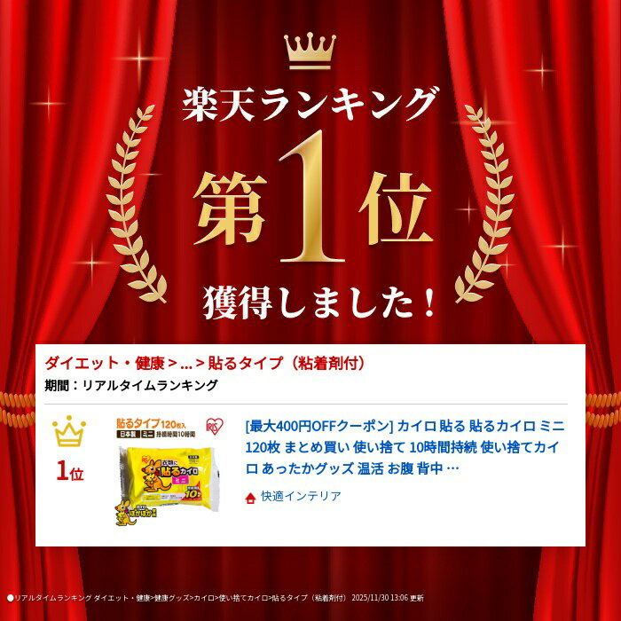 【PKN-30HM】■商品サイズ(cm)・幅約:13.5×奥行約13.6×高さ約10.7・幅約:9.6×高さ7(カイロのサイズ)■内容量:120個(30個×4箱)■材質:鉄粉、水、活性炭、バーミキュライト、塩類、高吸水性樹脂、木粉■平均温度:50度■最高温度:60度■持続時間:約10時間ミニサイズの衣類に貼るタイプの使い捨てカイロ☆ちょっと寒い時にかさばらないミニサイズ冬の必需品です。足腰の冷え、通勤通学、屋外作業、レジャー・スポーツ観戦にお勧めです。[検索用:カイロ 貼る 寒さ対策 あったか グッズ 冷え 使い捨てカイロ 使い捨て 4905009678976] 最強翌日配送対象商品に関するご案内 最強翌日配送対象商品・対象地域に該当する場合は最強翌日配送マークがご注文カゴ近くに表示されます。 最強翌日配送可能なお支払方法は【クレジットカード、代金引換、全額ポイント支払い】のみとなります。 下記の場合は最強翌日配送対象外となります。 15点以上ご購入いただいた場合、 時間指定がある場合、 ご注文時備考欄にご記入がある場合、 決済処理にお時間を頂戴する場合、 郵便番号や住所に誤りがある場合、 最強翌日配送対象外の商品とご一緒にご注文いただいた場合、 お届け先住所文字数が40文字以上の場合 関連キーワード(本商品の説明ではありません)母の日 父の日 敬老の日 こどもの日 クリスマス バレンタイン ホワイトデー ハロウィン お正月 成人の日 成人式 記念日 誕生日 卒業式 入学式 お歳暮 お中元 春 夏 秋 冬 梅雨 節分 ひな祭り 七夕 十五夜 初詣 年越し 夏祭り 花火大会 結婚祝い 内祝い 出産祝い 快気祝い 還暦祝い 古希 喜寿 傘寿 米寿 卒寿 白寿 百寿 新築祝い 引っ越し祝い 開店祝い 開業祝い 就職祝い 昇進祝い 合格祝い 銀婚式 金婚式 七五三 長寿祝い 御礼 お母さん お父さん 義母 義父 祖父 祖母 おばあちゃん おじいちゃん 娘 息子 彼氏 彼女 恋人 友達 上司 先輩 後輩 同僚 キッズ 子供 幼児 ベビー 赤ちゃん 育児 学生 社会人 シニア 10代 20代 30代 40代 50代 60代 70代 80代 90代 一人暮らし 単身赴任 主婦 主夫 新生活 家族暮らし 子育て 旅行 トラベル ライブ ホームパーティ ビジネス 法人 ギフト プレゼントくらしにプラス+ 最大400円OFFクーポン配布中利用期間:12月1日(月)0:00~12月7日(日)9:59クーポン獲得はこちら≫ ご注文前のよくある質問についてご確認下さい[ FAQ ] レビューキャンペーンレビュー投稿でもれなく全員に 次回使える5%OFFクーポンをプレゼント!※投稿が確認でき次第、ご登録のアドレスへクーポンURLをお送りします。