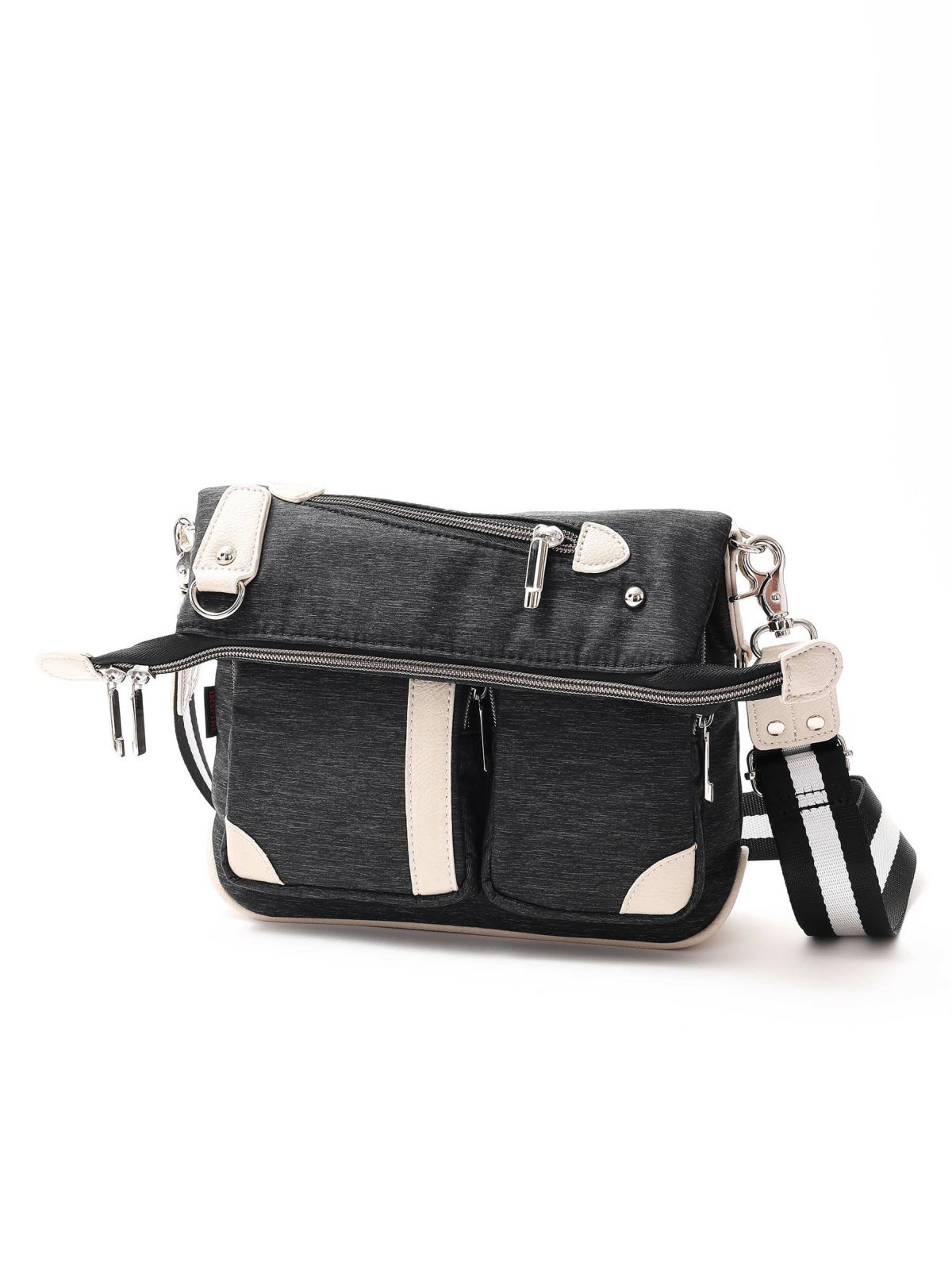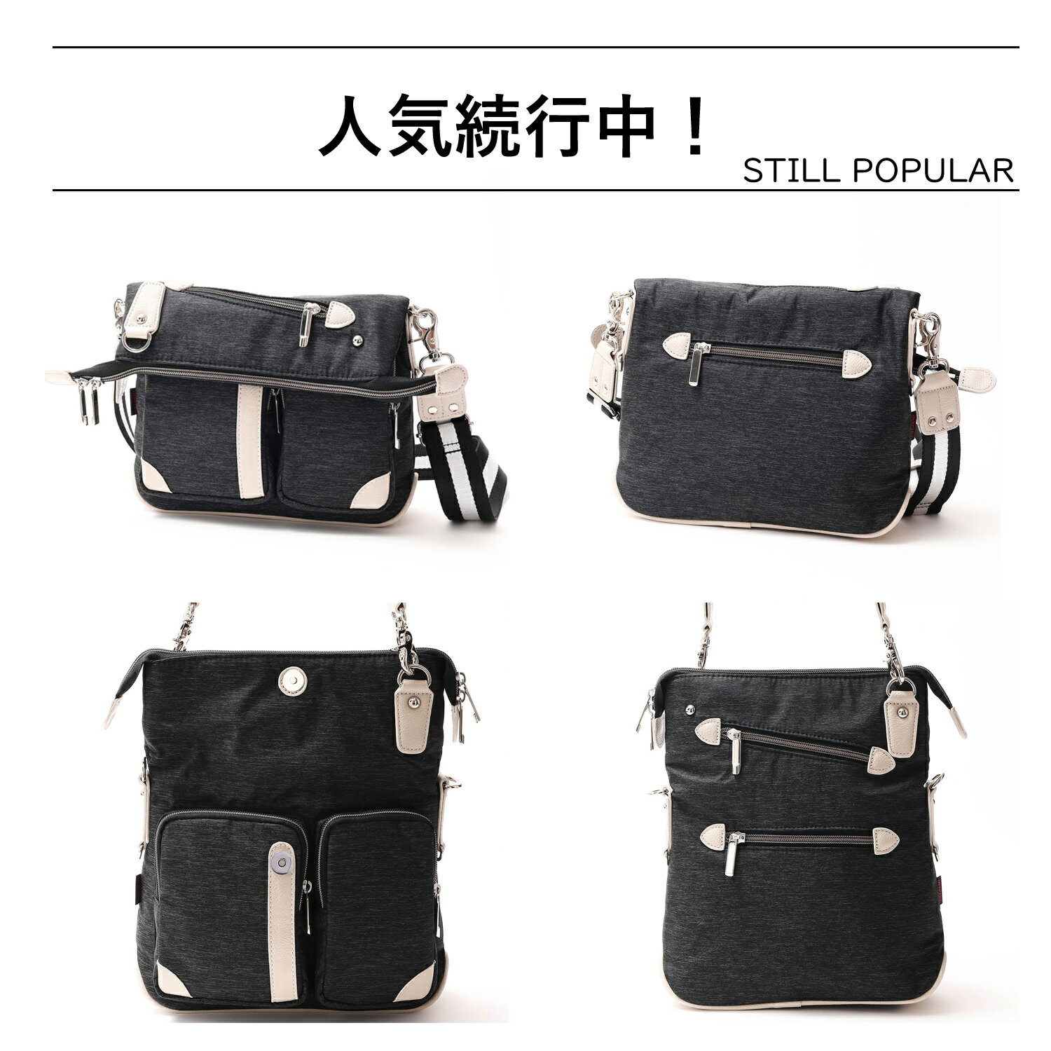 【インスパイア】口折れ 2WAYバッグ(小) ホワイトレザーがシャープな印象。 口折れなので、収納量に応じて使い分けが効くのと、ファスナー+口折れの2アクションは多目的に使えるので安心感があります。 長く愛されているバッグです。 サイズ 口折れパターン(写真1枚目と同様) タテ:20cm ヨコ:26cm マチ:4cm 口立てパターン タテ:30cm ヨコ:26cm マチ:4cm 素材 【本体】ナイロン 100% 【皮革部分】合成皮革
