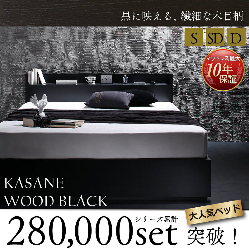 "黒に映える、繊細な木目柄 S SD D KASANE WOOD BLACK 大人気ベッドシリーズ累計 280,000set突破! 日本ならではの美しさを研究し、 進化を遂げたオリジナル木目デザイン。 理想の部屋、日本の暮らしに 最適なベッドが誕生しました。 KASANE WOOD BLACK 選べる3サイズ S/SD/D SIZE SINGLE:100cm SEMIDOUBLE:120cm DOUBLE:140cm お部屋に、お好みにあわせてお選びください NEW パワーアップしたセットマットレス EC市場NO.1※スプリングマットレス 世界の弾力がさらに進化! (※2024年11月~) シリーズ セットで特別お買得 最大18% オフ !| Special Thanks price 10年保証 CospaSleep セットで手に入る 期待以上の寝心地 WHITE マットレス BLACK マットレス 上質な眠りをお得にお届け。 セットで最大 18% OFF 選べるマットレス プラス+寝具で、ワンランクUPのお部屋がすぐに とろける毛布&シーツ ホテルスタイルカバーリング 羽根布団8点セット セットでお得! お得なコーディネートセット ベッド+マットレス+寝具 上質な眠りをお届けするお得なマットレスセット、KASANE WOOD BLACKのためにセレクトしたコーディネートセットで お部屋をワンランクアップさせてみてはいかがですか? 選ばれ続ける魅力 この一台に、類を見ない程の魅力を詰め込みました。 黒に映える繊細な木目柄 業界No.1の大容量収納 計算しつくされたシンプルデザイン 美しさと機能を兼ね備えたベッド 魅力01 繊細な木目柄。他にはない、KASANEの黒 深い黒にうっすらと浮かび上がる、繊細な木目。 何度も試行錯誤を繰り返しこだわり抜いた、KASANEの黒。 深い黒の中に木目の美しさが魅せる繊細なウッドブラックを、 ぜひご堪能ください。 華麗さも、収納も、快適も、この黒で叶える。 WOOD BLACK COLLECTION 重厚感と上品さを兼ね備えたウッドブラックは、どんなお部 屋にも。雰囲気がぐっと変わります。 2台並べてもクール。ブラックとの組み合わせはもちろん、 違うカラーとの組み合わせも秀逸。 Monotone Urban modern Hotel style アーバンモダンにも、ホテルライクにも… お気に入りのデザインカバーと一緒に様々な表情を魅せてく れるのが、KASANE WOOD BLACK。 ブラックマットレスとのクールな組み合わせもおすすめ。 魅力02 お部屋が変わる。業界No.1の大容量収納 二杯収納 スペース有効活用でお部屋をスマートに 引き出しだけで115リットル以上 高さ15cm キャスター付き 左右どちらでも設置OK! ベッド下は、2杯の引き出し収納付き。 サイズがバラバラな物もまとめて収納。 キャスター付きだからスムーズにさっと取り出せます。 隠し収納 収納家具を置かない選択を可能に 全部で360リットル以上 ※Sサイズ SD…423リットル/ D…571リットル ここは自由な空間! 季節家電や旅行鞄もすっきり。 2杯の引き出し 左右どちらにも取り付け可能。 大容量収納 かさばる寝具や洋服、収納ボックスを入れても。 引き出し、床板の下にたくさんの収納スペース。大きなもの まで入るから、お部屋をさらにスマートにしてくれます。 魅力03 計算しつくされた、シンプルデザイン 横から見たL字のシルエットも魅せどころ 機能性 美しく使いやすいヘッドボード 広々した棚に、本や時計、お気に入りのものがたくさん置け ます。朝も、夜も癒しの空間がここにあります。 ティッシュも置ける13cmの奥行、2口あるコンセントも 魅力的。充電しながらゆっくりおやすみいただけます。 堂々たる姿 正面からの美しさにもうっとり 魅力04 美しさと機能を兼ね備えた、二刀流 通気性 美しい黒の、すのこ構造 湿気の逃げ場がないと、ダニやカビ発生の原因に。KASANE ウッドブラックは、日本の住環境を考えた高通気すのこ構造。 一年中、快適にお過ごしください。 ※床板の上には必ずコイルマットレスを敷いてご使用ください。 リッチ製法 ALLシート貼り。どこからみても黒 なめらかな手触り カビにも強く美しい 木のような風合い 後ろ姿まで、黒く美しく。 背面、引き出しの内側、床板まで シートをふんだんに使うことで、 どこから見ても黒く、美しい佇まい。 ※天然木ではありません どんな時も美しいウッドブラックが、うれしい。お手入れの 時も、いつだってお気に入りの黒にかこまれて。 360度check ※右側に引き出し設置時 ※引き出しの反対側には、市販の収納ケースも入ります 背面 背面まで、360度黒く美しいベッドに仕上げました。 引き出しは左右どちらかに取り付けます。引き出しの反対側は、 収納ケースなどを自由に収納できます。 ベッドフレームを二台並べると、ぴったり隙間なくくっつきます。 28万台の説得力 「通販でいい」ではなく「通販だからこそ」を目指して。No.1だからこそ、考え続ける。 例えば、スプリングマットレスを圧縮して届けること。家具を小さなパッケージで届けること。これまで、多くのスタンダードを日本で最初に開発してきました。高品質なものを、多くの人にこれからも届けていいくために、改革を続けています。 独自の検査基準を設け、厳しく審査。 改良・変更は、実に50回以上 業界を先駆ける様々な改革。