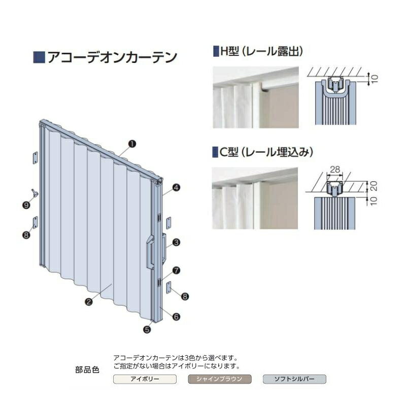 ■間仕切り アコーディオンカーテン ■メーカー:タチカワブラインド ■商品仕様:片開き(両開きの場合は半分のサイズを2台ご購入下さい) ■生地機能:防炎、SIAA抗菌加工、防汚加工 ■レザー素材:塩化ビニル樹脂 ■生地名:アクセンテ ※アクセントカラーが彩りを添えて、空間を引き立てます。 ■生地品番:AC8113 AC8114 AC8115 AC8116 ※アコーディオンカーテンはお部屋の間仕切り、収納スペース確保、冷房暖房効率の向上、ワークスペースの確保など様々な方法でプライベート空間を演出します。 ※製品と床面とのすきまを防ぐ「すきまガード〈オプション〉」を使えば、光漏れを防ぎ、冷暖房効率がさらに高まります。 シーンや用途に合わせたオプションの鍵の使用もおすすめ。 注)メーカー希望小売価格はメーカーカタログに基づいて掲載しています。アコーディオンカーテン AC-8113 アクセンテ 部品色:アイボリー アコーディオンカーテン AC-8114 アクセンテ 部品色:シャインブラウン アコーディオンカーテン AC-8115 アクセンテ 部品色:ソフトシルバー ■カラー ■間仕切り アコーディオンカーテン■メーカー:タチカワブラインド■商品仕様:片開き(両開きの場合は半分のサイズを2台ご購入下さい)■生地機能:防炎 SIAA 抗菌 防汚■生地名:アクセンテ■生地品番:AC8113 AC8114 AC8115 AC8116 ※生地カラーはお客様のご使用のモニターの状態や環境により実際のものと異なって見える場合がございます。イメージ違い等の返品交換はお受けできませんのでご注意ください。必ずサンプルご請求の上、お買い求め下さい。 【サンプル請求につきまして】 楽天市場ではサンプル請求のページ機能が廃止されたため、オーダー商品(ブラインド・ロールスクリーン。アコーディオンカーテン・カーペットなど)のサンプル請求ができなくなっております。 お手数ではございますがサンプル請求いただきます場合、メールを頂戴するか、問い合わせよりご請求お願い致します。 rakuten@interior-fuji.com ※お問合せから御請求の場合、必ず非公開にて設定して下さい。 ■アコーディオンカーテンご購入をご検討の客様へ この商品はオーダー商品となりますのでご決済完了後のキャンセル・返品・交換・寸法変更なども承れませんので予めご了承の上、ご購入下さい。 当店ではご決済完了後、再度変更等がないかどうかの『確認メール』をお送りするシステムをとっております。『確認メール』が届きましたら再度内容をご確認の上、ご返信下さい。返信が届きましてからの商品製作開始となりますのでご返信が遅延しますとお届けにさらに時間がかかりますので必ずご返信いただけますようお願い致します。 お客様にオーダー商品をより確実にお届けするために行っているシステムですのでご理解の程、よろしくお願い致します。 【アコーディオンカーテンの採寸に際して注意点】 ご用意いただくもの・・・・メジャー・筆記用具・紙 ■採寸の際の注意点 ※必ず、2回以上採寸して下さい。 ※取付下地が木部もしくは窓枠(集成材など)であることを確認して下さい。 石膏ボ−ド下地で桟の入っていない 場所などには取り付け不可能です。 ※幅は必ず天井面(上部)で測って下さい。 床面で測られた 場合、違う場合があります。 ※幅180cm以上の場合は左右両方の高さを測って下さい。 左右で違う場合は短い方を取付高さとして下さい。 ※必ずご注文のサイズは取付たかさから2cm差し引くことを忘れないでください。 ※幅は実寸から約5〜10mm差し引いていただくとハンガーレールをカットしなくてすみますので取付簡単になります。 ■幅・高さ共1cm単位で製作となります。 幅が広い場合は必ず3ケ所ぐらい採寸して下さい。一番低い場所の寸法で2cm引いてご注文下さい。 ■アコーディオンは構造上、寸法直しができませんのでくれぐれもお間違えのないように採寸して下さい。 【1】採寸して下さい 【2】開きを指定して下さい。 (両開き) (片開き) ※両開きご注文の場合、片開きサイズを2台ご注文の上、開きの選択肢で『2台注文で両開き仕様にする』を 選択して下さい。この場合ハンガーレールは1本になります。