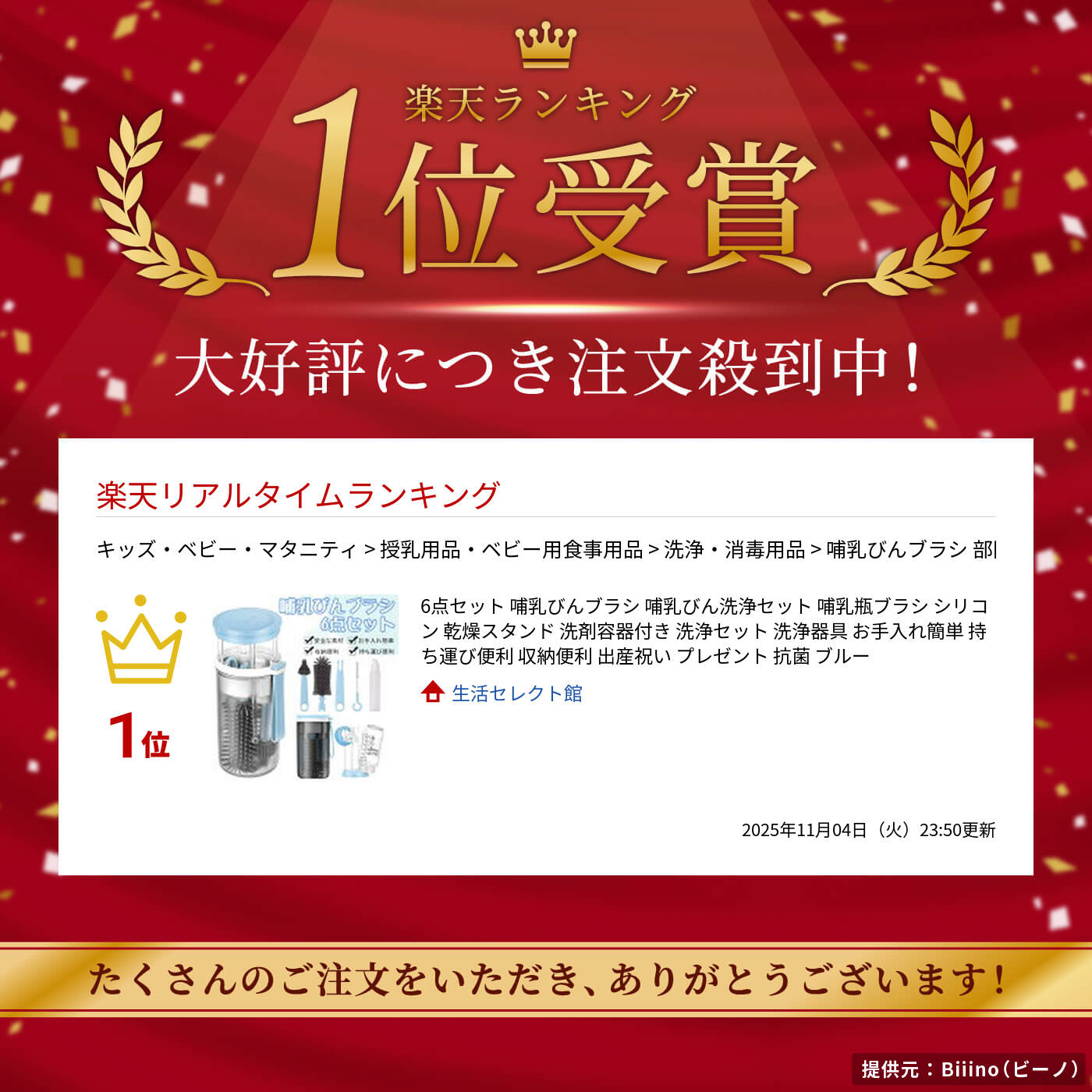【6点セットの哺乳瓶ブラシ】 6in1の多機能哺乳瓶クリーニング用品です。 1.洗剤容器(50ml) 2.哺乳瓶ブラシ(組み立てと分解が簡単) 3.乳首ブラシ(乳首の形をしたデザイン) 4.ナイロンブラシ(長いストローや手が届きにくい部分まできれいに洗う) 5.磁気乾燥ラック(とつり下げ設計で収納便利) 6.収納ボトル(ディップイン消毒カップまたはボトルウォーミマーカップとしても使用できる) 【洗浄力抜群&赤ちゃんの健康のために】 スポンジブラシとは異なり、シリコンは水分を吸収せず、速乾性で汚れの溜まりを防ぎます。哺乳瓶ブラシは毛先が密集し、360度洗浄ができ、ボトルの壁に十分に接触し、隅々まで掃除します。高密度のナイロン毛でストローをきれいにします。ミルクの残留物をきれいにし、赤ちゃんに安全かつ衛生的に哺乳瓶を使用させましょう。 【ママを安心させる素材】 高品質なABS、食品グレードのPE素材を採用しており、無臭、安全、錆びなく、抗菌レベルが抜群で、耐久性にも強いです。厚いしっかりとした材質で加工されていますので、頑丈で安定性に優れます。防水仕様なので、暖かい水で洗えて、いつも清潔を保てます。【商品説明】 【6点セットの哺乳瓶ブラシ】 6in1の多機能哺乳瓶クリーニング用品です。 1.洗剤容器(50ml) 2.哺乳瓶ブラシ(組み立てと分解が簡単) 3.乳首ブラシ(乳首の形をしたデザイン) 4.ナイロンブラシ(長いストローや手が届きにくい部分まできれいに洗う) 5.磁気乾燥ラック(とつり下げ設計で収納便利) 6.収納ボトル(ディップイン消毒カップまたはボトルウォーミマーカップとしても使用できる) 【洗浄力抜群&赤ちゃんの健康のために】 スポンジブラシとは異なり、シリコンは水分を吸収せず、速乾性で汚れの溜まりを防ぎます。哺乳瓶ブラシは毛先が密集し、360度洗浄ができ、ボトルの壁に十分に接触し、隅々まで掃除します。高密度のナイロン毛でストローをきれいにします。ミルクの残留物をきれいにし、赤ちゃんに安全かつ衛生的に哺乳瓶を使用させましょう。 【ママを安心させる素材】 高品質なABS、食品グレードのPE素材を採用しており、無臭、安全、錆びなく、抗菌レベルが抜群で、耐久性にも強いです。厚いしっかりとした材質で加工されていますので、頑丈で安定性に優れます。防水仕様なので、暖かい水で洗えて、いつも清潔を保てます。 【磁気乾燥ラック】 ボトルを掃除した後、乾燥ラックを使用する必要があります。哺乳瓶、おしゃぶり、乳首、ボトル、などの水切りに適用。最も速く衛生的で最適な乾燥が得られ、また細菌繁殖を防止、お互いの汚染を防げます。乳瓶用スタンドは、台座に4個のマグネットを内蔵しており、蓋を閉めやすい。台座の重さも増すので、哺乳瓶をかけたときに落ちにくくなります。 【携帯便利】