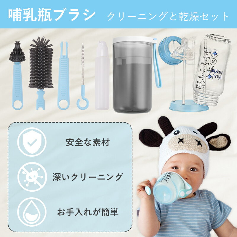 6点セット 哺乳びんブラシ 哺乳びん洗浄セット 哺乳瓶ブラシ シリコン 乾燥スタンド 洗剤容器付き 洗浄セット 洗浄器具 お手入れ簡単 持ち運び便利 収納便利 出産祝い プレゼント 抗菌 ブルー