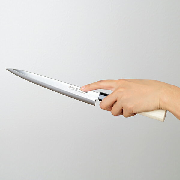 サイズ約 40.5(cm)刃渡り:約27(cm)内容量1本材質刃:ステンレス刃物鋼柄:白木種類右利き用、左利き用生産国日本製区分返品・キャンセル区分(小型商品)ギフトラッピングページを見る●本格刺身包丁27cmです。●左利きの方々にも配慮して設計された和包丁で、右利き用、左利き用がございます。●繊維を傷付けない口当たりの良さは、刺身包丁でしか出すことができません。●持った感触が柔らかく、使えば使うほど手に馴染んでくる本格仕上げの白木柄です。●木の柄は温かみがあり、冬場でもひんやりしません。●錆びに強く、お手入れが簡単でご家庭で扱いやすいステンレス刃物鋼製です。●研ぎ直しして長年お使い頂けます。●刃物産業の盛んな岐阜県関市の刃物です。おすすめポイント「左利き」の方必見! 利き手に合った包丁を和包丁は片刃仕上げになるので、右利き用・左利き用がありますが、どんなに良い包丁を使っても、ご自身の手に合ったものを使わなければ、その包丁の良さが最大限に発揮されません。 利き手に合った包丁を使用すると、あまりの使いやすさに驚かれるでしょう。まるで料理の腕が上がったように感じるかもしれません。左利き用はもちろん、右利き用もご用意してます。 刺身包丁があれば切り口が違う 本格刺身包丁 27cm刺身を切り身で買うより、ブロックで買う方がお安くなります。その時に必要なのが、刺身包丁です。普通の三徳包丁でも切れますが、切り口が全然違い、口に入れた時に違いが分かります。繊維を傷付けない口当たりの良さは、刺身包丁でしか出すことができません。本格仕上げの白木柄持った感触が柔らかく、使えば使うほど手に馴染んできます。木の柄は温かみがあり、冬場でもひんやりしません。ステンレス刃物鋼錆びに強く、お手入れが簡単でご家庭で扱い易い材質です。研ぎ直しして長年お使い頂けます。刃の厚み刺身を引き切りするため、細長く、薄い片刃が付いています。ロゴ入り刃物産業の盛んな岐阜県関市の刃物です。初めての方にぜひ! 和包丁でお料理の幅が広がるご家庭のキッチンを本格的和包丁でそろえてみませんか。 見た目にもプロ仕様で、初めて和包丁を握る方にもおすすめです。 出刃包丁、刺身包丁合せて6種類、左利き用・右利き用両方をそろえたシリーズ展開です。大切なお客様へお届けするために最後まで人の手によって検品・仕上げを行っています大切なお客様の元へ安全、安心、自信のある包丁をお届けできるよう、人の手によって手入れ、何度もの検品、最後の箱詰め作業を行っています。シリーズ紹介(1)出刃包丁13.5cm(2)出刃包丁15.5cm(3)出刃包丁18cm(4)刺身包丁21cm(5)刺身包丁24cm(6)刺身包丁27cm関連キーワード:人気 便利 おすすめ 調理用品 料理道具 台所用品 キッチンアイテム キッチン小物 キッチン雑貨 調理器具 キッチン用品 実用的 料理好き 釣り 魚料理 お造り 切り身 魚 捌く さばく 鮮魚 オススメ 高品質 本格 家庭用 国産 プレゼント ギフト 贈り物 母の日 父の日 結婚祝い LH3286 LH277関連商品はこちら刺身包丁 24cm 濃州正宗 日本製 ステンレ2,480円刺身包丁 21cm 濃州正宗 日本製 ステンレ2,280円柳刃包丁 27cm 兼義作 水牛口 和包丁 日33,000円刺身包丁 20cm PISCES オールステン2,580円柳刃包丁 21cm 兼義作 水牛口 和包丁 日24,200円柳刃包丁 24cm 兼義作 水牛口 和包丁 日27,500円柳刃包丁 18cm 兼義作 水牛口 和包丁 日22,000円出刃包丁 18cm 濃州正宗 日本製 ステンレ2,980円特選 刺身包丁 20cm 濃州正宗 日本製 和1,480円出刃包丁 13.5cm 濃州正宗 日本製 ステ2,580円出刃包丁 15.5cm 濃州正宗 日本製 ステ2,680円包丁 刺身包丁 刃渡り 270mm 業務用 M46,200円