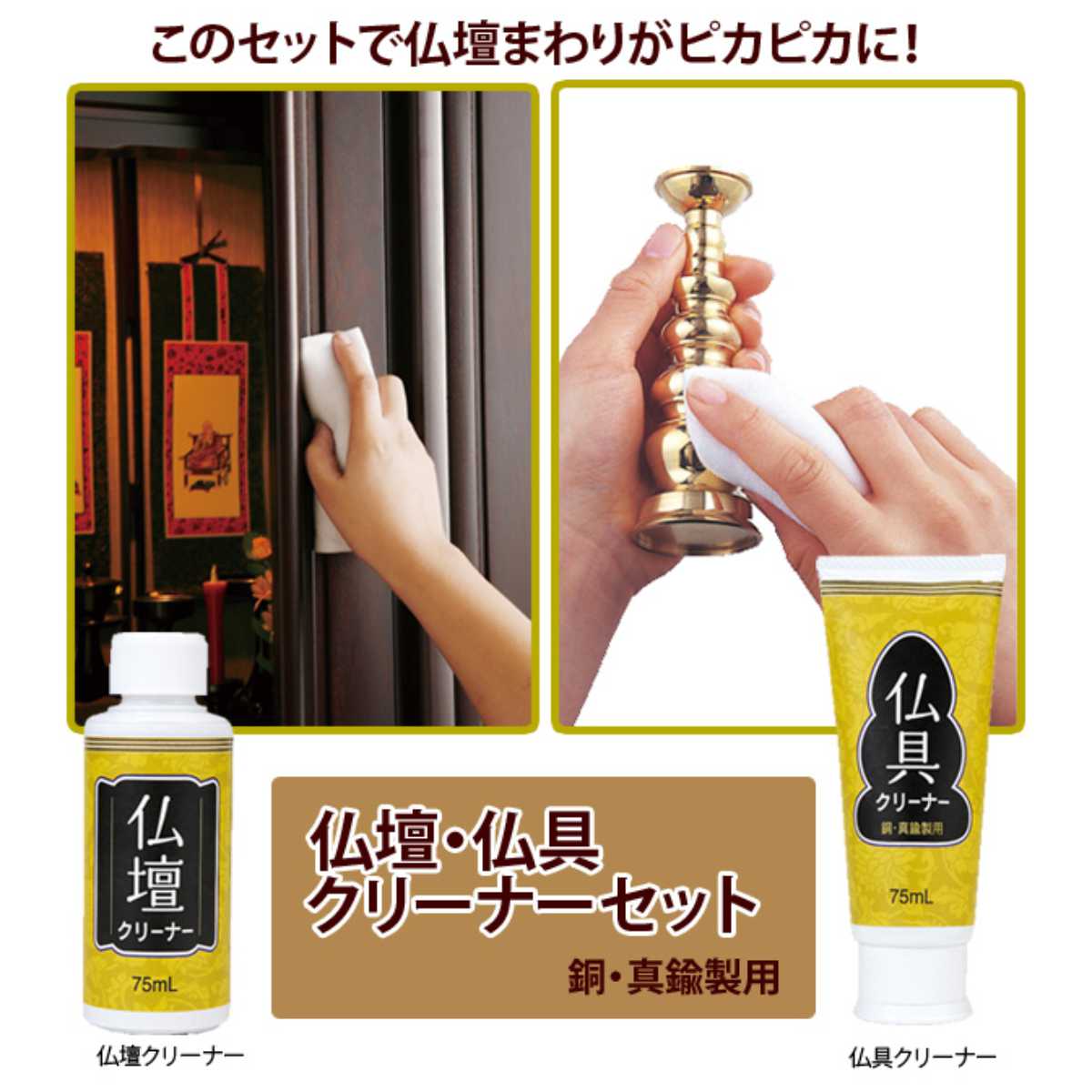 仏壇・仏具クリーナーセット ( 仏壇クリーナー 仏具クリーナー クリーナー 掃除 洗浄 汚れ落とし 清掃 仏具 仏壇 漆器 銅 真鍮 研磨剤 日本製 艶出し ツヤ出し 金属磨き 金属みがき 金仏壇 塗仏壇 漆塗 お手入れ ) 【39ショップ】