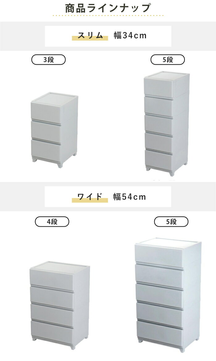 サイズ【スリム 3段】約 幅34×奥行43×高さ66.1(cm)引き出し内寸:約 幅26.3×奥行36.1×高さ16.1(cm)【スリム 5段】約 幅34×奥行43×高さ106.1(cm)引き出し内寸:約 幅26.3×奥行36.1×高さ16.1(cm)【ワイド 4段】約 幅54×奥行41.7×高さ86.1(cm)引出し内寸:約 幅46.3×奥行36.1×高さ16.1(cm)【ワイド 5段】約 幅54×奥行41.7×高さ106.1(cm)引出し内寸:約 幅46.3×奥行36.1×高さ16.1(cm)重量【スリム 3段】約 3.6kg【スリム 5段】約 5.7kg【ワイド 4段】約 7.4kg【ワイド 5段】約 9.1kg内容量1個材質本体:ポリプロピレンすべり止め:ウレタンフォームカラーホワイト、ダークブラウン、ライトグレー、グレージュ生産国日本製引き出し【スリム 3段】3段【スリム 5段】5段【ワイド 4段】4段【ワイド 5段】5段引き出し1段あたり耐荷重【スリム 3段】【スリム 5段】約2kg【ワイド 4段】【ワイド 5段】約3kg天板耐荷重【スリム 3段】【スリム 5段】約2kg【ワイド 4段】【ワイド 5段】約3kg組立状態お客様組立品備考【収納目安】【スリム 3段】【スリム 5段】Yシャツ:6枚、セーター:4枚、バスタオル:4枚【ワイド 4段】【ワイド 5段】Yシャツ:8枚、セーター:6枚、バスタオル:6枚区分返品・キャンセル区分(大型商品)チェスト 壁付き デコニーシーヴォ ほこりが入らないおすすめポイント側面・背面に凹凸が少なくお手入れ簡単パネル付きで側面と背面に凹凸が少なくフラットなチェストです。拭き掃除などお手入れしやすく清潔に保つことができます。引き出し内にホコリが入りにくいパネルで覆っているため、ホコリの溜まりを軽減し、引き出しの中にホコリが入りにくい仕様です。収納物が見えず生活感を隠せる収納物が見えないため生活感を感じさせません。中の見えないスッキリとしたデザインは、リビング、キッチン、ランドリーなどさまざまな場所のインテリアに馴染みます。商品詳細掃除がしやすい脚付き家具調の脚部分は、すべり止め付きです。脚があることで床との間にすき間ができて掃除がしやすいです。脚は付け外し可能です。引き出し1段あたりの収納目安 【スリム】引き出し1段あたりの耐荷重:約2kg天板の耐荷重:約2kg1段あたりの収納目安:Yシャツなら6枚、セーターなら4枚、バスタオルなら4枚【ワイド】引き出し1段あたりの耐荷重:約3kg天板の耐荷重:約3kg1段あたりの収納目安:Yシャツなら8枚、セーターなら6枚、バスタオルなら6枚光沢をおさえたマットな質感サラサラの手触りで、光沢をおさえたマットな質感のシボ加工が施されています。引出し抜け落ち防止ストッパー引き出しの裏にはストッパー付きで、最大に引き出しても抜ける落ちる心配がありません。工具不要で簡単組み立て工具を使わず簡単に組み立てられます。商品画像※こちらは【スリム 5段】の画像を使用しています。カラーサイズ関連キーワード:ランドリー収納 衣装ケース 脚付き 洋服 脱衣所 デコニー 収納タンス スリム ワイド リビング クローゼット 収納ボックス ランドリーチェスト 壁付収納チェスト 衣替え 収納用品 収納BOX 子ども部屋 子供部屋 洗面所 ランドリー キッチン バスタオル Yシャツ セーター おもちゃ 押入れ 押し入れ 家具調 小物入れ 衣類 洋タンス ホコリ対策 お手入れ ホワイト ブラウン グレー ベージュ 白 茶 国産 三段 四段 五段 3段 4段 5段 LH5797関連商品はこちらチェスト 壁付き デコニーシーヴォ ワイド 59,980円チェスト 壁付き デコニーシーヴォ ワイド 47,980円チェスト 壁付 デコニーシーヴォ 3段 幅344,370円チェスト 5段 幅54cm ノーデュス ワイド10,800円チェスト 3段 幅54cm ノーデュス ワイド6,780円チェスト 3段 幅34cm ノーデュス スリム4,580円チェスト Roocent ルーセント キャスタ3,980円~チェスト ルームスシェード 北欧 プラスチック3,380円~チェスト ノーデュス 幅34cm 幅54cm 4,580円~チェスト 5段 プラスチック リルデココ 北欧9,080円チェスト 4段 プラスチック リルデココ 北欧7,780円チェスト 3段 プラスチック リルデココ 北欧6,578円