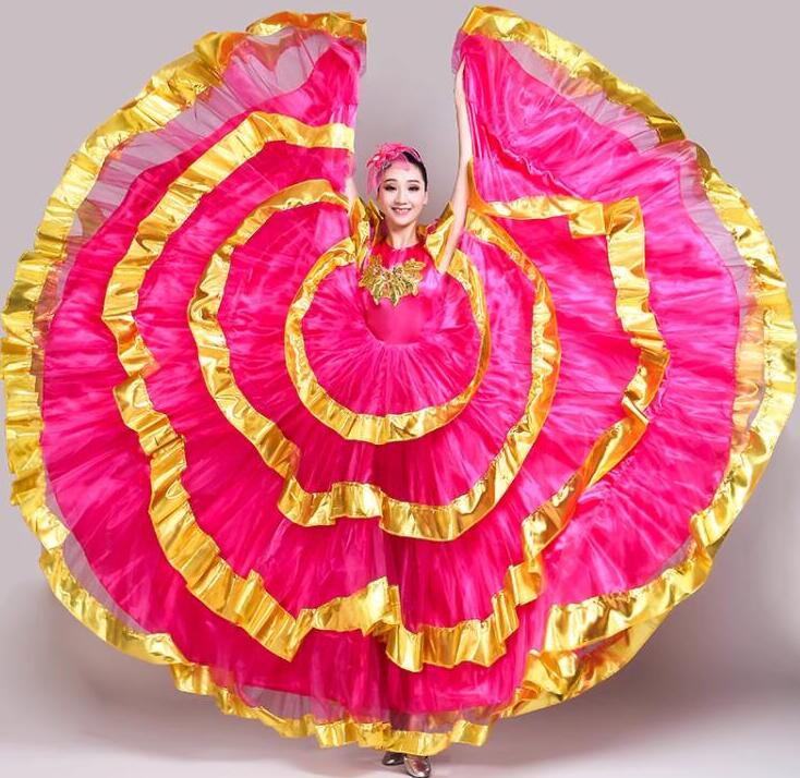 社交ダンス レディースワンピース 大人 フラメンコ モダン ドレス 半袖 金色大きい裾 広がる ダンス 衣裳 マキシ丈 ロング丈 360°540° 720° きらきら ワルツ チャチャチャ モダン ドレス 民族ダンス フラメンコ 合唱 群舞 演出 ワンピース