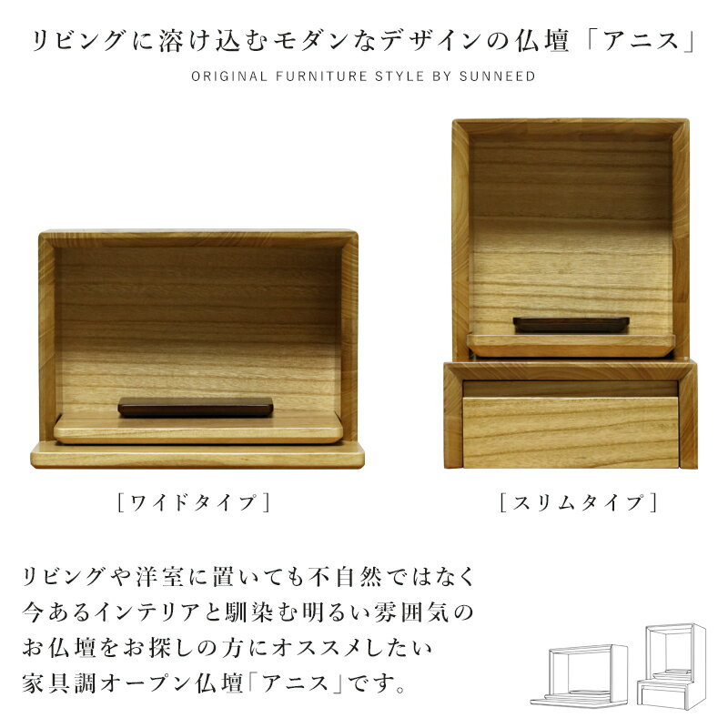 商品サイズスリムタイプ:幅21×奥行21×高さ30(cm) ワイドタイプ:幅30×奥行21×高さ21.3(cm) ※仏壇内部の棚は可動式となります。材質天然木(桐) 塗装:ウレタン樹脂塗装仕様完成品仏具は付属しません。※木製品の特性について材質において木目や製品の仕上がりには必ずバラつきが生じますこと、手彫りや塗装など手作業の端部は職人の技量等により仕上げムラ等がございますこと、予めご承知おき下さいませ。お求めやすい価格を実現するため、通常のご使用において見えない部分や見えにくい箇所につきましては、表面材としては使用しない材料を用いコストダウンを図っております。製品は、工場から完全梱包の状態で出荷されますが、輸入商品ということもございまして長距離輸送の間に梱包材との摩擦等によって僅かな擦り痕等がついてしまうこともございます。上記のとおり、色ムラや木材の節目へこみ擦り痕や傷等は必ずあるものとお考え下さい。交換返品などご要望いただいた場合も、当店にて通常にご使用いただくうえで問題がないと判断させていただきました場合はご対応はいたしかねます。恐れ入りますが予めご了承下さいませ。必ずお読みください。※商品撮影時の撮影機材、ご使用のPC環境によって商品の色が実際の色と多少異なる場合がございます。ご了承ください。※ 製造上または製品改良のため、予告なく仕様変更する場合がございますのでご了承下さい。 オススメアイテム / RECOMMEND ステージ型 ミニタイプ ステージ型 据置タイプ