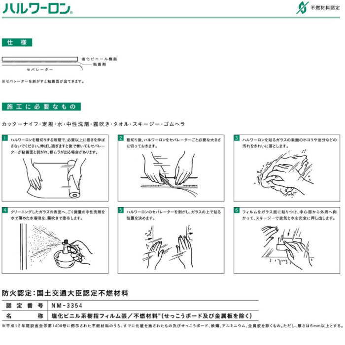 特長 ごく微量の中性洗剤を水で薄めた水溶液を使用して施工を行って下さい。 窓ガラス全面に貼られる場合、窓枠いっぱいに貼らず周囲2〜3mm隙間をあけて下さい。 ジョイントの施工をする場合は、ジョイント部分の水を抜きやすくするため、少し隙間をあけて下さい。 空気や水抜きをする際は、スキージー、ゴムヘラ等で完全に押し出してください。 スリガラス等、凸凹のある物への施工はお避けください。 耐候性に優れたPVCを使用しておりますが、屋外での使用には不向きです。 飛散防止効果もございますが、衝撃の程度等によりガラスが飛び散る場合もございます。 光線透過率64.6% UVカット率94%(参考値) ※写真はイメージです。●お支払い方法で代引きはできません。 ●基本的に法人向けになります。個人宅配送は送料追加で1980円かかります。なので送料3300円/個口です。量が多い場合個口ごとに送料3300円でしたら弊社に入れた方が安いのでご相談ください。 ●サイズが大変大きいため直送の際はお時間指定はできません。発送前でも配送手配に入っておりましたらキャンセルできません。 ●画像はイメージです。スキャナやカメラ、またご使用のパソコン等ディスプレイにより見え方が変わるかもしれません。あらかじめご了承ください。 ●日曜日祝日配送、夜間配送、お時間指定はできません。 ●沖縄へは配送できません。離島の場合送料別途お見積りとなります。 ●サンプルの手配も可能です。 関連商品 ●ガラス装飾フィルム ハルワーロン LP-52 無地 0.13mm 1000mm巾×5m巻 1本 ●ガラス装飾フィルム ハルワーロン LP-52 無地 0.13mm 1000mm巾×20m巻 1本 ●ガラス装飾フィルム ハルワーロン LP-52 無地 0.13mm 1000mm巾 10cm(1m以上50cm単位) ●ガラス装飾フィルム ハルワーロン LP-2 雲竜 0.13mm 1000mm巾×5m巻 1本 ●ガラス装飾フィルム ハルワーロン LP-2 雲竜 0.13mm 1000mm巾×20m巻 1本 ●ガラス装飾フィルム ハルワーロン LP-2 雲竜 0.13mm 1000mm巾 10cm(1m以上50cm単位) ●ガラス装飾フィルム ハルワーロン LP-90 不織布 0.13mm 1000mm巾×5m巻 1本 ●ガラス装飾フィルム ハルワーロン LP-90 不織布 0.13mm 1000mm巾×20m巻 1本 ●ガラス装飾フィルム ハルワーロン LP-90 不織布 0.13mm 1000mm巾 10cm(1m以上50cm単位) ●ガラス装飾フィルム ハルワーロン LP-80 生なり雲竜 0.13mm 1000mm巾×5m巻 1本 ●ガラス装飾フィルム ハルワーロン LP-80 生なり雲竜 0.13mm 1000mm巾×20m巻 1本 ●ガラス装飾フィルム ハルワーロン LP-80 生なり雲竜 0.13mm 1000mm巾 10cm(1m以上50cm単位) ●ハルワーロン LP-95 ホワイトフォール 0.13mm 1000mm巾×5m巻 1本 ●ハルワーロン LP-95 ホワイトフォール 0.13mm 1000mm巾×20m巻 1本 ●ガラス装飾フィルム ハルワーロン LP-95 ホワイトフォール 0.13mm 1000mm巾 10cm(1m以上50cm単位) ●ハルワーロン LP-97 ホワイトクロス 0.13mm 1000mm巾×5m巻 1本 ●ハルワーロン LP-97 ホワイトクロス 0.13mm 1000mm巾×20m巻 1本 ●ガラス装飾フィルム ハルワーロン LP-97 ホワイトクロス 0.13mm 1000mm巾 10cm(1m以上50cm単位)
