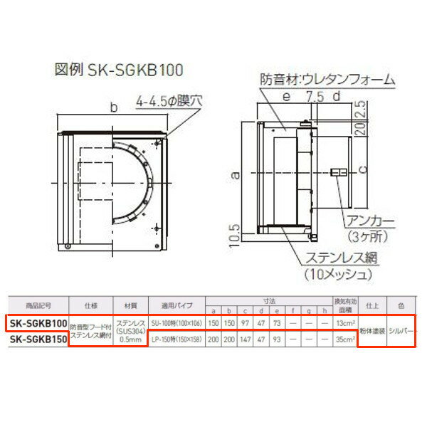 特長ステンレス網は10メッシュです。フード部は脱着可遮音性能:径100「T-2」相当、SRKB型との組み合わせで径100は「T-3」相当になります。仕様:防音型フード付、ステンレス網付材質:ステンレス(SUS304)0.5mm適用パイプ:SU-100特(100×106)寸法:a/150、b/150、c/97、d/47、e/73換気有効面積:13平方cm仕上:粉体塗装