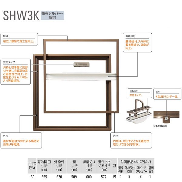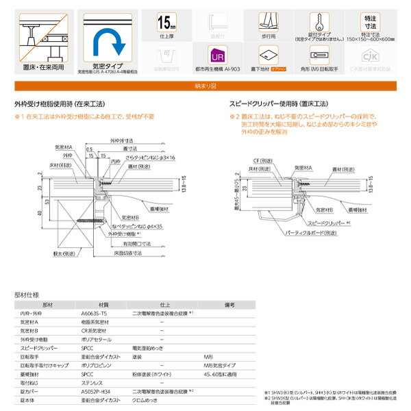 置床・在来両用でスピード施工・気密タイプ。 部材/材質/仕上 内枠・外枠/A6063S-T5/陽極酸化塗装複合皮膜 気密材A/樹脂系気密材/- 気密材B/CR系気密材/- 外枠受け樹脂/ポリアセタール/- スピードクリッパー/SPCC/電気亜鉛めっき 回転取手/亜鉛合金ダイカスト/塗装/M形 回転取手取付けキャップ/ポリプロピレン/-/M形気密タイプ 蓋補強材/SPCC/粉体塗装/45、60に適用 取付ねじ/ステンレス/- 錠カバー/A5052P-H34/陽極酸化皮膜 錠本体/亜鉛合金ダイカスト/クロムめっき 取手用穴あけ寸法は、18×83mm(角穴もしくは長穴)です。 12mmの合板にクッションフロア(t1.8〜3)を貼り合わせることもできます。 厚さ15mmのフロア材で2枚以上つなぎ合わせる場合は、SH(F/W)21型をご使用ください。●納期目安(平日のみカウントメーカーから卸に入る目安のためここからさらに日はかかります。):10日 ●サイズが大きいためお支払い方法で代引きはできません。 ●北海道、沖縄県、離島への配送は送料別途お見積りです。 ●オーダー品につき、ご注文後のキャンセルやご変更、返品等はお受けできません。予めご了承ください。 ●メーカー直送に付き、お届け時間のご指定はできません。基本的にBtoBなので細かいサービスをお求めになるのはご遠慮ください。 ●他メーカーと同梱できません。他メーカー品と一緒にご注文の場合は送料ご了承の旨備考欄に記載ください。記載がない場合は確認メールを送信させていただきますのでご返信いただけるまでは保留になります。 ●1ケースの場合の入り数:1 ※フローリング仕上げの場合、強度が不足することがありますのでご注意ください。 フローリングにはSHF21型、HFPB3型が適しています。やむをえずフローリングで仕上げる場合は、蓋補強材を追加してご使用ください。 12mmの蓋材を使用する場合は、2.5mm程度の合板(ベニヤ板)を捨て張り(接着)してください。 ただし強度が不足することがありますので、その場合は蓋補強材を追加してください。 関連商品 ●ダイケン ホーム床点検口 SHF320 ブロンズ 1台 ●ダイケン ホーム床点検口 SHF330 ブロンズ 1台 ●ダイケン ホーム床点検口 SHF345 ブロンズ 1台 ●ダイケン ホーム床点検口 SHF360 ブロンズ 1台 ●ダイケン ホーム床点検口 SHF320K ブロンズ 鍵付き 1台 ●ダイケン ホーム床点検口 SHF330K ブロンズ 鍵付き 1台 ●ダイケン ホーム床点検口 SHF345K ブロンズ 鍵付き 1台 ●ダイケン ホーム床点検口 SHF360K ブロンズ 鍵付き 1台 ●ダイケン ホーム床点検口 SHW320 シルバー 1台 ●ダイケン ホーム床点検口 SHW330 シルバー 1台 ●ダイケン ホーム床点検口 SHW345 シルバー 1台 ●ダイケン ホーム床点検口 SHW360 シルバー 1台 ●ダイケン ホーム床点検口 SHW320K シルバー 鍵付き 1台 ●ダイケン ホーム床点検口 SHW330K シルバー 鍵付き 1台 ●ダイケン ホーム床点検口 SHW345K シルバー 鍵付き 1台 ●ダイケン ホーム床点検口 SHW360K シルバー 鍵付き 1台 ●ダイケン ホーム床点検口 SHN330 ステンカラー 1台 ●ダイケン ホーム床点検口 SHN345 ステンカラー 1台 ●ダイケン ホーム床点検口 SHN360 ステンカラー 1台 ●ダイケン ホーム床点検口 SHN330K ステンカラー 鍵付き 1台 ●ダイケン ホーム床点検口 SHN345K ステンカラー 鍵付き 1台 ●ダイケン ホーム床点検口 SHN360K ステンカラー 鍵付き 1台 ●ダイケン ホーム床点検口 SHH330 ホワイト 1台 ●ダイケン ホーム床点検口 SHH345 ホワイト 1台 ●ダイケン ホーム床点検口 SHH360 ホワイト 1台 ●ダイケン ホーム床点検口 SHH330K ホワイト 鍵付き 1台 ●ダイケン ホーム床点検口 SHH345K ホワイト 鍵付き 1台 ●ダイケン ホーム床点検口 SHH360K ホワイト 鍵付き 1台