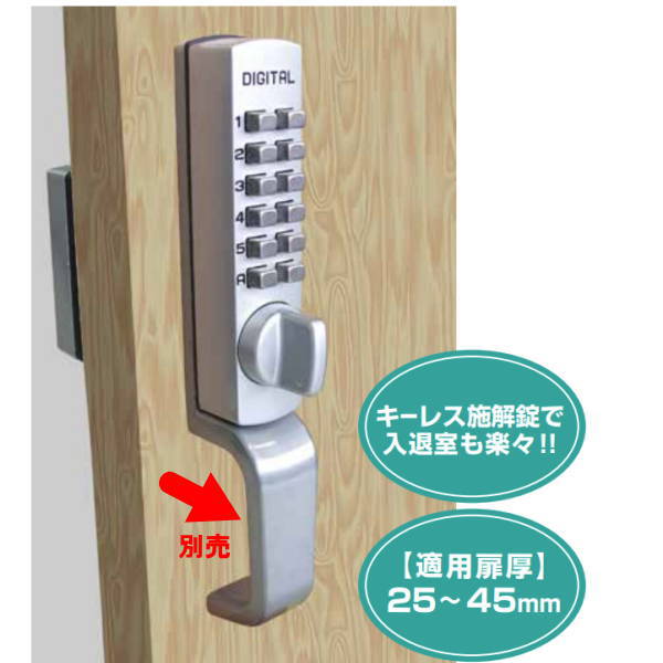 プッシュボタン式面付本締錠の決定版 コンパクトサイズでローコスト キーレス施解錠で入退室も楽々 解錠が簡単 外部ツマミでクリアにし、暗証番号を押してツマミを回すだけ。 施工も簡単 ドアにφ8mmの貫通穴を3ヵ所あけて取付。 番号変更も簡単 簡単手順で変更が可能。(変更手順マニュアル付属) 安心・信頼の日本製 信頼の国内製造。ハイテクメカニカル構造で停電や電池切れによる不作動の心配がありません。 適用扉厚:25〜 45mm 材質 本体:亜鉛ダイカスト / デッドボルト:SUS430●お取り寄せになります。お取り寄せに4日〜4週間かかる場合があります。 ●お支払い方法で代引きはできません。