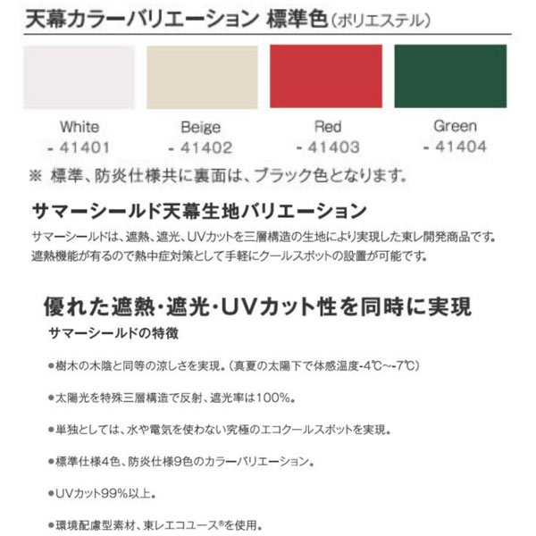 フレームカラーバリエーション ・ホワイト/ブラウン 二次電解着色のため、塗装と比べて剥離や退色が大幅に改善されました。 ・木目調(4色)スーパーファインコート 焼付け塗装後、木目模様のフィルムを水圧転写し再度焼付け塗装を施しております。 天幕カラーバリエーション 超耐候生地 PARA/アクリル生地 遮熱生地 サマーシールド 東レ 防炎生地 ソルテリア/ポリエステル生地 別売 SEG推薦ベース RB-30-40-50 G-30-55-80 埋め込みベース 最大直径:4000mm 総高 :2740mm 軒先 :1900mm 心棒経 :50Φ 重量 :24.3kg 推薦ベース:型番50以上●こちらの商品はお支払方法が代引きでの発送ができません。 ●あらかじめ納期、送料をお問い合わせください。 ●法人宛て、個人宅宛てによっても送料が変わります。 ●メーカー欠品時は納期がかかります。あらかじめご確認いただければ確認させていただきます。 ●お時間指定、休日や祝日配送、夜間配送はできません。再配送が有料になる場合があります。軒先渡しです。 ●個人宅は追加送料が必要な場合や配送不可の場合があります。 ●写真はイメージです。ご返品やキャンセルはできませんのであらかじけご了承ください。 関連商品 ●富士 パラソル SEGseries 天幕PARA(アクリル) フレームホワイト/ブラウン スタンダードタイプ SEG-4000L-3707 受注生産 ●富士 パラソル SEGseries 天幕PARA(アクリル) フレーム木目調 スタンダードタイプ SEG-4000L-3707 受注生産 ●富士 パラソル SEGseries 天幕サマーシールド フレームホワイト/ブラウン スタンダードタイプ SEG-4000L-3707 受注生産 ●富士 パラソル SEGseries 天幕サマーシールド フレーム木目調 スタンダードタイプ SEG-4000L-3707 受注生産 ●富士 パラソル SEGseries 天幕ソルテリア(ポリエステル) フレームホワイト/ブラウン スタンダードタイプ SEG-4000L-3707 受注生産 ●富士 パラソル SEGseries 天幕ソルテリア(ポリエステル) フレーム木目調 スタンダードタイプ SEG-4000L-3707 受注生産 ●富士 パラソル SEGseries 天幕サマーシールド防炎 フレームホワイト/ブラウン スタンダードタイプ SEG-4000L-3707 受注生産 ●富士 パラソル SEGseries 天幕サマーシールド防炎 フレーム木目調 スタンダードタイプ SEG-4000L-3707 受注生産 ●富士 パラソル SEGseries 天幕PARA(アクリル) フレームホワイト/ブラウン 耐風タイプ SEG-4000L-3707 受注生産 ●富士 パラソル SEGseries 天幕PARA(アクリル) フレーム木目調 耐風タイプ SEG-4000L-3707 受注生産 ●富士 パラソル SEGseries 天幕サマーシールド フレームホワイト/ブラウン 耐風タイプ SEG-4000L-3707 受注生産 ●富士 パラソル SEGseries 天幕サマーシールド フレーム木目調 耐風タイプ SEG-4000L-3707 受注生産 ●富士 パラソル SEGseries 天幕ソルテリア(ポリエステル) フレームホワイト/ブラウン 耐風タイプ SEG-4000L-3707 受注生産 ●富士 パラソル SEGseries 天幕ソルテリア(ポリエステル) フレーム木目調 耐風タイプ SEG-4000L-3707 受注生産 ●富士 パラソル SEGseries 天幕サマーシールド防炎 フレームホワイト/ブラウン 耐風タイプ SEG-4000L-3707 受注生産 ●富士 パラソル SEGseries 天幕サマーシールド防炎 フレーム木目調 耐風タイプ SEG-4000L-3707 受注生産 ●富士 パラソルベース RBシリーズ RB30-□ H180 ●富士 パラソルベース RBシリーズ RB40-□ ●富士 パラソルベース RBシリーズ RB50-□ ●富士 パラソルベース Gシリーズ G30型-13287 38Φ用 ●富士 パラソルベース Gシリーズ G30型-13288 50Φ用 ●富士 パラソルベース Gシリーズ G80型(3枚重ね)-13291 38Φ用 ●富士 パラソルベース Gシリーズ G80型(3枚重ね)-13292 50Φ用 ●富士 パラソルベース Gシリーズ G55型(2枚重ね)-13289 38Φ用 ●富士 パラソルベース Gシリーズ G55型(2枚重ね)-13290 50Φ用 ●富士 パラソルベース Gシリーズ G型アンカー用ベース-7947 38Φ用 ●富士 パラソルベース Gシリーズ G型アンカー用ベース-7948 50Φ用