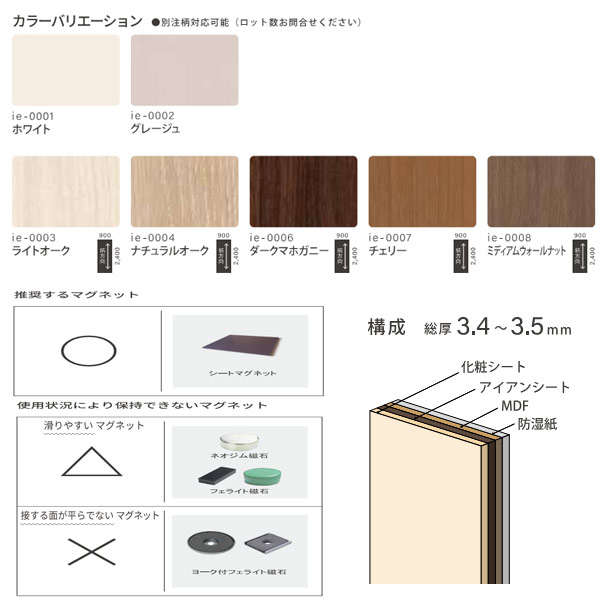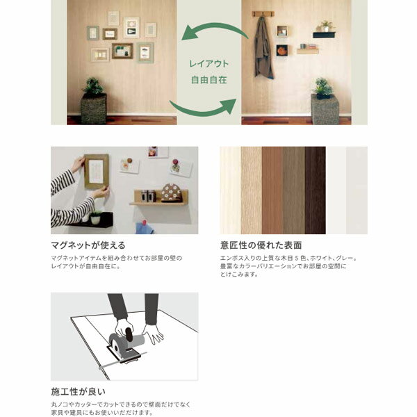 マグネットがつく優れた意匠性の壁面材 特長 ・マグネットが使える マグネットアイテムを組み合わせてお部屋の壁のレイアウトが自由自在に。 ・意匠性の優れた表面 上質な木目5色、ホワイト、グレー。 豊富なカラーバリエーションでお部屋の空間にとけこみます。 ・施工性が良い 丸のこやカッターでカットできるので壁面だけでなく家具や建具にもお使いいだだけます。 シックハウス症候群対応 国土交通大臣認定商品 (F☆☆☆☆) 使用用途 リビング、玄関 サイズ:幅900×長さ2400×厚み3.4〜3.5mm 重量(1梱包):約10kg 材質:化粧シート/アイアンシート/MDF/防湿紙●北海道、沖縄県は別途送料がかかります。離島は配送不可となります。 ●お届け先が個人宅の場合はは配送不可のため受注できません。営業所留めや引き取りはできないです。 ●お時間指定はできません。日曜日、祝日配送はできないです。地域によっては土曜日に不可のところがあります。 ●大きいサイズで大変なので一度でお受け取りお願いいたします。再配送や持ち戻りや待機などはできないです。 ●玄関渡しや軒先渡し、トラックから遠くへ運んだりは運送会社の仕事ではないのでできないです。現場は2024年7月時点ではOKですがトラックから遠くへ運んだりはできません。 ●返品、交換、発注後のキャンセルはできません。納品日・配送先変更が出来ませんので予めご了承下さい。 ●納入は基本的に車上お渡しとなります。 ●法人宛でもトラックが入れない場合などは営業所お引き取りになる場合があります。 ●写真はイメージです。 保持力について アイパネルは鉄を練り込んだゴムを使用しており、施工性、加工性に優れている分、通常の鉄板に比べて、マグネットの保持力は弱くなります。 ●モノを載せる棚やBOX、モノを吊るすフックといったアイテムについては、市販のマグネット商品では弱いので、アイパネルにベストなマグネットアイテム「HEYADECO KAGU ヘヤデコカグ」を推奨致します。 ●マグネットの保持力は種類や形状により異なります。使用の前に必ずご確認ください。 間違ったご使用をされた場合に問題が生じましても責任を負いかねますので、ご使用の際、十分ご注意願います。 関連商品 ●ニチレイマグネット アイパネル ie-000● 3×8 900×2400 1枚 ●ニチレイマグネット アイパネル見切材 ALC-ie000● 2.73m 1本