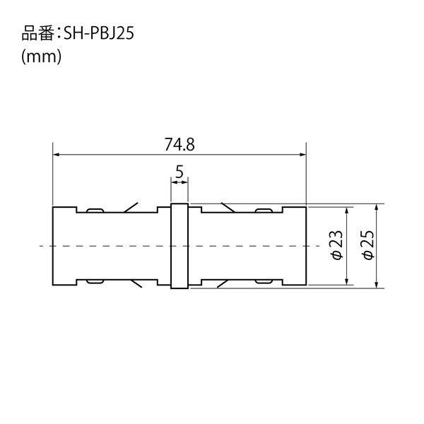 ワンタッチで簡単にパイプを連結できるジョイント 差し込むだけで板バネが効いてガッチリロック。 2本のパイプをつないで長尺パイプに。 継ぎ目もフラットで目立ちにくい。 ねじ止め不要。 本体サイズ(mm):W74.8×H25×D25。 対応パイプ:φ25mm。 【材質】本体:亜鉛ダイカスト、板バネ:鋼鉄。 仕上:クロームメッキ。 耐荷重(ブラケットを600mm間隔で使用した場合。):約65kg。 注意事項 パイプの厚みによっては、耐荷重が異なりますので注意ください。パイプメーカーによっては多少の内径寸法(厚み)が異なる場合がございます。使用パイプの厚みが、約1.2〜0.8mmが標準です。緩みが生じる場合は使用しないで下さい。●仕様・寸法・デザインについては予告なく変更されることがあります。 ●画像はイメージです。代表画像を使用することがあります。 ●ご返品、交換、発注後のキャンセルはできません。 ●都度お取り寄せ発注のため突然の欠品等がありましたら連絡させていただきます。 関連商品 ●ニューヒカリ ワンタッチパイプジョイント φ25mmパイプ用 クローム SH-PBJ25C ●ニューヒカリ ワンタッチパイプジョイント φ32mmパイプ用 クローム SH-PBJ32C ●ニューヒカリ ワンタッチパイプジョイント φ25mmパイプ用 ブラック SH-PBJ25K ●ニューヒカリ ワンタッチパイプジョイント φ32mmパイプ用 ブラック SH-PBJ32K
