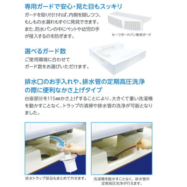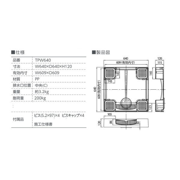特長 排水口のお手入れや、排水管の定期高圧洗浄の際に便利なかさ上げタイプ台座部分を120mmにかさ上げすることにより、大きくて重い洗濯機を動かすことなくトラップの清掃や排水管の洗浄が可能となりました。 新色ニューホワイト。インテリアに馴染む、スッキリとしたホワイトが登場。 清潔感溢れる空間を演出します。 有効内寸:W609×D609 材質:PP 排水口位置:中央(C) 排水勾配:X=1/90 Y=1/60 重量:約3.2kg 耐荷重:200kg●こちらの商品はお支払い方法で代引きができません。 ●離島への配送は送料が追加でかかる場合があります。 ※防水パンには別途排水トラップが必要です。 ※防水パンの本体色がニューホワイトの場合、トラップの目皿色はニューホワイトが標準となります。 ※防水パンの本体色がアイボリーホワイトの場合、トラップの目皿色はアイボリーホワイトが標準となります。 ●写真はイメージです。ガードなしの販売ページです。 ●北海道は別途送料2592円、沖縄県は4752円になります。 ●他メーカーの商品と同梱はできません。それぞれに送料がかかります。 関連商品 ●テクノテック かさ上げ防水パン セーフガードパン TPW640-CW1-GN ガード無し W640×D640×H120 アイボリーホワイト ●テクノテック かさ上げ防水パン セーフガードパン TPW640-CW1-G1 ガード1個付き W640×D640×H120 アイボリーホワイト ●テクノテック かさ上げ防水パン セーフガードパン TPW640-CW1-G2 ガード2個付き W640×D640×H120 アイボリーホワイト ●テクノテック かさ上げ防水パン セーフガードパン TPW640-CW1-G3 ガード3個付き W640×D640×H120 アイボリーホワイト ●テクノテック かさ上げ防水パン セーフガードパン TPW640-CW2-GN ガード無し W640×D640×H120 ニューホワイト ●テクノテック かさ上げ防水パン セーフガードパン TPW640-CW2-G1 ガード1個付き W640×D640×H120 ニューホワイト ●テクノテック かさ上げ防水パン セーフガードパン TPW640-CW2-G2 ガード2個付き W640×D640×H120 ニューホワイト ●テクノテック かさ上げ防水パン セーフガードパン TPW640-CW2-G3 ガード3個付き W640×D640×H120 ニューホワイト ●テクノテック かさ上げ防水パン セーフガードパン TPW640-CB1-GN ガード無し W640×D640×H120 テクノブラック ●テクノテック かさ上げ防水パン セーフガードパン TPW640-CB1-G1 ガード1個付き W640×D640×H120 テクノブラック ●テクノテック かさ上げ防水パン セーフガードパン TPW640-CB1-G2 ガード2個付き W640×D640×H120 テクノブラック ●テクノテック かさ上げ防水パン セーフガードパン TPW640-CB1-G3 ガード3個付き W640×D640×H120 テクノブラック