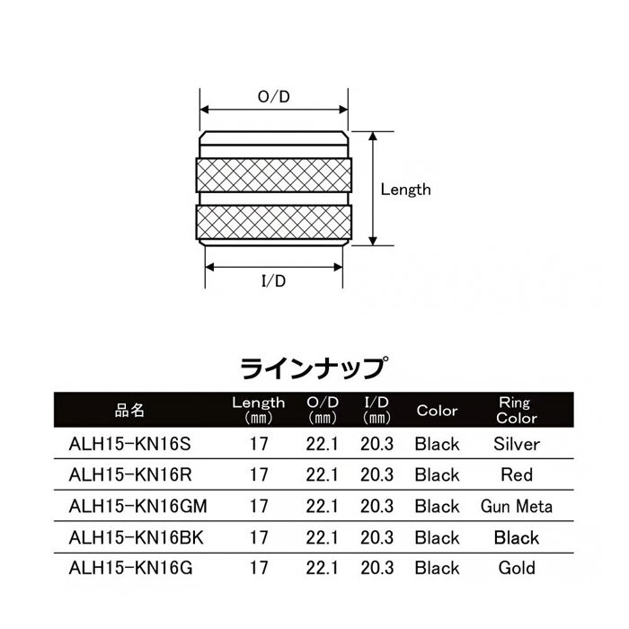 ALH15-KN16 series KN用フロントグリップ KN16フード(KDPS-16/ASH)用 アルミフード ローレット加工 全長17mm 内径20.3mm 外径22.1mm ゴールド シルバー レッド ガンメタ ブラック 金 黒 赤 銀 ジャストエース JUSTACE ファイブコア グリップ 釣り ロッドビルディング