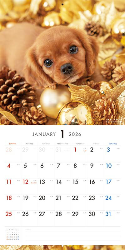 色鮮やかな花々と植物に囲まれたキャバリアの愛らしい子犬たちのフォトカレンダー! 月ごとに変わるテーマカラーで、一年中お部屋を華やかに演出してくれます。 ●かわいいミニ判も一緒にいかがですか? PICTWANカレンダー2026 【S判】キャバリア はこちら>> 【カレンダー 2,200円以上で送料無料!】 PICTWANカレンダー各種、ご注文合計税込2,200円以上で送料無料になります(システム上、送料が加算されますが、後ほどスタッフからのメールで送料無料に変更させていただきます)。 ※北海道・沖縄は別途、地域別送料がかかります。 ※カレンダー以外の商品を同時にご注文の場合は3,980円以上で送料無料です。 機能カレンダー/壁掛け用・ブックレット式(中とじ) サイズサイズ:288×288mm(開いた状態:288×576mm) 枚数28ページ(2025年9月〜2026年12月) 備考日本の祝日や行事が表記されています。 付属品オリジナルシール付き(280×280mm) 原産国日本