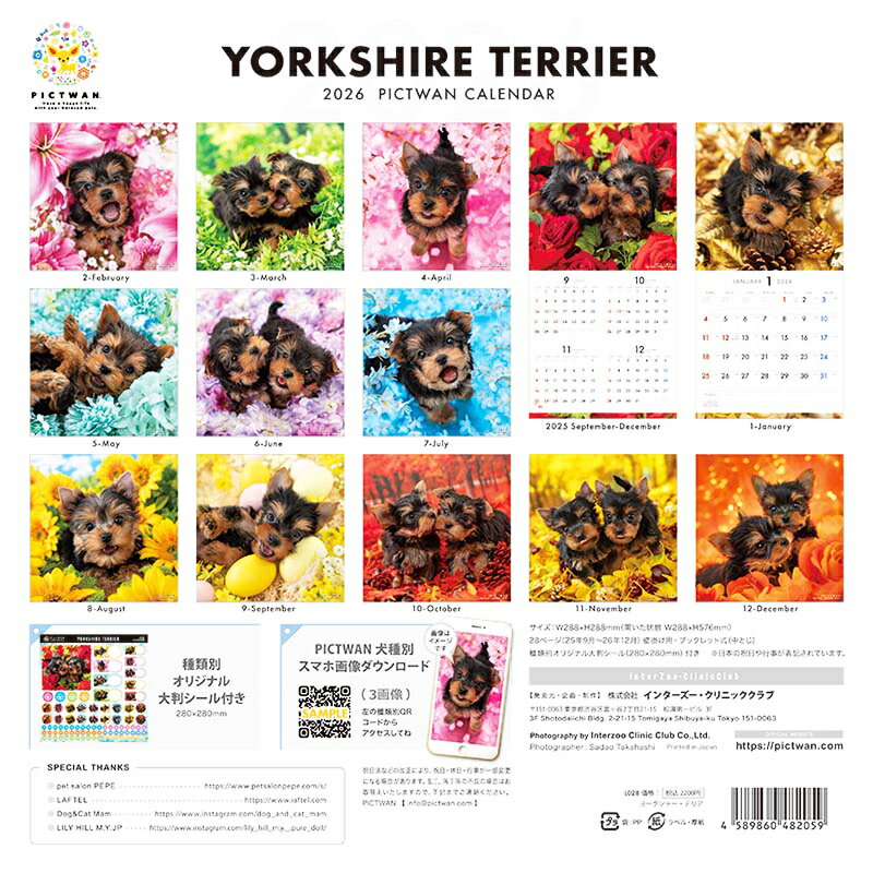色鮮やかな花々と植物に囲まれたヨークシャー・テリアの愛らしい子犬たちのフォトカレンダー! 月ごとに変わるテーマカラーで、一年中お部屋を華やかに演出してくれます。 ●かわいいミニ判も一緒にいかがですか? PICTWANカレンダー2026 【S判】ヨークシャー・テリア はこちら>> 【カレンダー 2,200円以上で送料無料!】 PICTWANカレンダー各種、ご注文合計税込2,200円以上で送料無料になります(システム上、送料が加算されますが、後ほどスタッフからのメールで送料無料に変更させていただきます)。 ※北海道・沖縄は別途、地域別送料がかかります。 ※カレンダー以外の商品を同時にご注文の場合は3,980円以上で送料無料です。 機能カレンダー/壁掛け用・ブックレット式(中とじ) サイズサイズ:288×288mm(開いた状態:288×576mm) 枚数28ページ(2025年9月〜2026年12月) 備考日本の祝日や行事が表記されています。 付属品オリジナルシール付き(280×280mm) 原産国日本