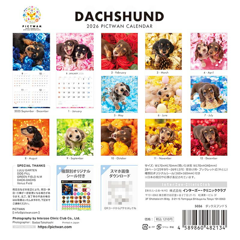 色鮮やかな花々と植物に囲まれた愛らしいダックスフンドの子犬たちのフォトカレンダー! コンパクトなS判(スモールサイズ)なので、玄関やキッチンなどのちょっとしたスペースにも。 ●迫力の大判サイズも一緒にいかがですか? PICTWANカレンダー2026 【L判】ダックスフンド はこちら>> 【カレンダー 2,200円以上で送料無料!】 PICTWANカレンダー各種、ご注文合計税込2,200円以上で送料無料になります(システム上、送料が加算されますが、後ほどスタッフからのメールで送料無料に変更させていただきます)。 ※北海道・沖縄は別途、地域別送料がかかります。 ※カレンダー以外の商品を同時にご注文の場合は3,980円以上で送料無料です。 【S判は5冊までゆうパケット可!】(組み合わせ自由) 配送方法で「ゆうパケット」を選び、かごに追加してください。 ・送料は全国一律220円(2冊以上で送料無料) ・北海道・沖縄への別途送料もかかりません。 ・郵便受けへの配達で、お届けまでに1週間ほどかかります。 ・システム上送料が加算されますが、後ほど220円(2冊以上は無料)に変更させていただきます。 ※ゆうパケット配送は代引不可・日時指定不可・他商品同梱不可となります。 ※S判カレンダー以外の商品と一緒に注文された場合は通常の送料がかかります。 機能カレンダー/壁掛け用・ブックレット式(中とじ) サイズサイズ:170×170mm(開いた状態:170×340mm) 枚数28ページ(2025年9月〜2026年12月) 備考日本の祝日や行事が表記されています。 付属品オリジナルシール付き(160×160mm) 原産国日本